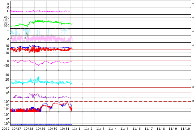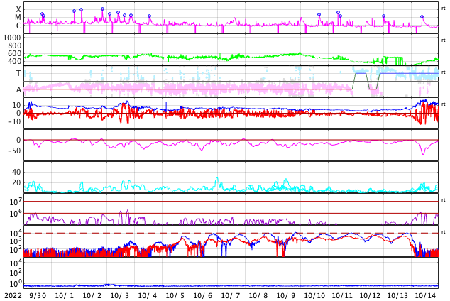2022/10/29 14:22 高速太陽風が到来し、磁気圏の活動が強まっています。
