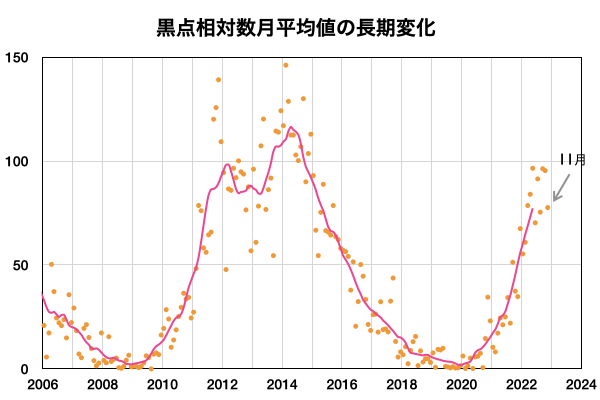2022/12/ 2 14:39 更新 高速の太陽風が続き、磁気圏も活動的です。11月の黒点相対数は 77.6 でした。 担当 篠原 WDC-SILSOより、11月の黒点相対数は 77.6 と発表されました。 9月、10月と95を超える値になっていたのですが、 11月は下がっています。 毎日の値を見ると、 11月の前半は90前後が続いていたのですが、 後半は50前後に下がっていて、 全体として平均が70台になった様です。 前の周期の第24期も、 2012年頃は50〜100の間を上下していて、 推移としては同じ様な状況と言えるかもしれません。 その一方、2011年後半の様な100を超える変化はまだ起きておらず、 今後に注目というところです。 太陽は、昨夕、1日16時(世界時1日7時)に、 北西(右上)の3152黒点群でM1.0の中規模フレアが発生しました。 Mクラスのフレアの発生は、11月19日のM1.6以来12日ぶりです。 また、南東の端(左下)に現れた3153黒点群で、 C1〜3の小規模フレアが5回ほど発生しています。 この領域の今後の活動に注目してください。 太陽風は、速度のグラフが不安定になっていますが、 550〜600km/秒の高速風が続いているようです。 磁場強度は、グラフの前半で10nTから6nTに急に下がり、 その後5nTと平均的な値まで下がっています。 磁場の南北成分は、南北に細かく変化していて、 磁気圏の活動は活発な状態が続いています。 AE指数は1000nTに達する大きな変化が繰り返し発生しています。 ただ、グラフの最後は変化が少なくなっていて、 太陽風の磁場強度が下がるとともに、 南向きの変化が少なくなっていることが影響している様です。 SDO衛星AIA193は、 中心部の南側を東西にやや淡いコロナホールが伸び、 東側には縦に濃いコロナホールが広がっています。 太陽風は、この後も速度が高まった状態が続くかもしれません。