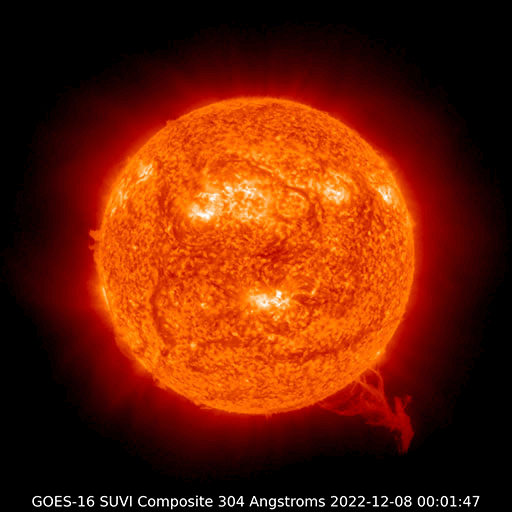 2022/12/ 9 16:17 更新 太陽風は高速風になっています。磁気圏は穏やかです。 担当 篠原 太陽風の速度は、 昨日のニュースの後に500km/秒台に達し、 夜以降、520〜550km/秒の高速の状態が続いています。 磁場強度は、5nTから12nTへ一旦高まりましたが、 速度が高まると反対に下がり始め、 現在は6nTと平均的な状態に戻っています。 磁場の南北成分は、 北寄りから0nT付近へ傾向が変化しています。 磁気圏は基本的に穏やかですが、 太陽風の磁場が一時的に南向きになった頃に、 AE指数で700nTの中規模の変化が発生しています。 この後、磁場が南寄りに傾向が変わるのであれば 磁気圏の活動も強まって行くでしょう。 SDO衛星AIA193では、 今回の高速風と関係すると思われるコロナホールは、 西の端に近付いています。 この後、影響は次第に弱くなって行きそうです。 太陽は、フレアの発生は少なく、 C1の変化が4回記録されている程度です。 一方、GOES衛星SUVI 304を見ると、 太陽の南西の端(右下)でプロミネンスの噴出が発生していて、 動画では、コロナのガスが ゆっくりと持ち上がっていく様子が見えています。 SOHO衛星LSDCO C2、C3では、 CME(コロナ質量放出)が右下に飛び出しています。 この動画では、直後に左に向かって飛び出すCMEも見えています。 太陽の向こう側の現象の様で、 ある程度規模の大きい変化が発生したのかもしれません。