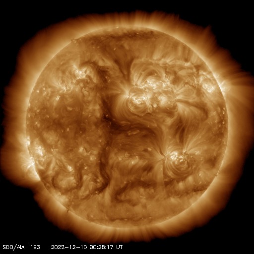 2022/12/10 09:51 更新 Cクラスのフレアが頻繁に発生しています。高速の太陽風が続いています。 担当 篠原 太陽の南東の端(左下)から新しい領域が現れ、 Cクラスの小規模フレアが頻繁に発生する様になっています。 この1日ほどの活動の様子を、 SDO衛星AIA131の動画で紹介します。 規模の大きいものとしては、 9日20時半(世界時9日11時半)のC4.0、 9日23時(世界時9日14時)のC6.0、 10日1時半(世界時9日16時半)のC4.5などがあります。 X線グラフの最後で発生しているC5.0のフレアは、 中心部北側(上)の3157群で発生しています。 この後、活動は強まるでしょうか。 注目して下さい。 太陽風は530km/秒程度の高速の状態が続いていましたが、 グラフの最後で少し下がり、500km/秒を割りかけています。 コロナホールの影響の終わりが近づいているのかもしれません。 磁場強度は、5nTから7nTへ少し上がっています。 磁場の南北成分は、やや北寄りで推移している様です。 磁気圏の活動は全体としては穏やかで、 AE指数は、磁場が一時的に南向きに変化した頃に 600nTの中規模の変化が1回発生した程度で、 その他は変化がありません。 SDO衛星AIA193では、目立つ様なコロナホールはありません。 太陽風は次第に穏やかになりそうです。 ![]() 太陽の南東の端でCクラスのフレアが続いています。 (c) SDO衛星AIA131 (NASA)、(動画加工 : 宇宙天気ニュース) ![]() SDO衛星のAIA193カメラによる太陽コロナの様子 (c) SDO (NASA) ![]() SDO衛星による太陽の可視光写真。マウスの矢印を写真に重ねると、黒点番号付きの写真に切り替わります。 (c) SDO (NASA) ![]() GOES衛星の太陽X線強度。赤・橙 = 0.1〜0.8 nm、青・紫 = 0.05〜0.4 nm (c) データ:NOAA/SWPC、作図:宇宙天気ニュース ![]() DSCOVRが観測した太陽風の磁場(黒線は全体の強度、赤線は南北成分) 磁場の向き、プラズマの密度、速度、温度 (c) データ:NOAA/SWPC、作図:宇宙天気ニュース ![]() AE指数(速報値) 下段のAEグラフの値が高くなると、オーロラ活動が活発化しています。 (c) 京都大学WDC ![]() ![]() 27日の太陽周期に合わせた図 太陽が同じ面を地球に向けていた27日前の変化から、今後を予想することができます。 (c) 作図:宇宙天気ニュース