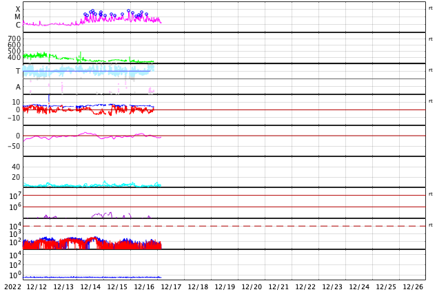 2022/12/17 13:04 更新 太陽ではMフレアが続きましたが、現在は活動が少し落ち着いています。 担当 篠原 活発にフレアを起こしている3165黒点群は、 太陽の南西の端(右下)に達しています。 昨日のニュースの後も、M1台のフレアを5回起こし、 16日19時(世界時16日10時)にM4.0、 16日23時半(世界時16日14時半)にM2.4、 さらに、17日0時半(世界時16日15時半)にM1.2と 中規模フレアが続きました。 一連の活動の様子を、GOES衛星SUVI 131の動画で紹介します。 3165群の領域でフレアの輝きが連続しています。 その後は活動の規模が一段下がり、 Cクラスの活動に留まっていますが、 C3〜9の変化が10回程度発生している様です。 この後、3165群は西の端に沈んで見えなくなりますが、 活動も終わりになるのか、一旦休んで再び強まるのか、 引き続き注目してください。 太陽風は、図の途中でデータが途切れていますが、 330km/秒と低速の状態が続いている様です。 磁場強度は5nTから4nTに下がりかけています。 磁気圏は穏やかで、 AE指数は小さい変化が見られる程度です。 SDO衛星AIA193では、 太陽の中心部の南北それぞれにコロナホールが見えています。 影響が来るとすると、3日後の20日頃になりそうです。 一方、27日周期の図を見ると、 前周期の太陽風は、11月25日から速度が高まっています。 この変化が回帰すると考えると、 5日後の22日頃になりそうです。 実際はどの様に推移するでしょうか。 来週にかけて変化に注目して下さい。