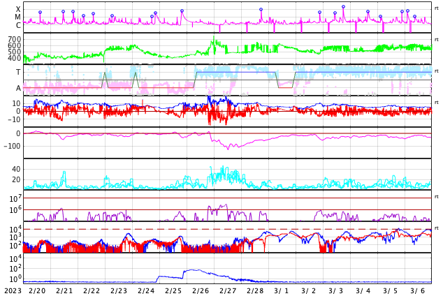 GOES衛星の太陽X線強度。赤・橙 = 0.1〜0.8 nm、青・紫 = 0.05〜0.4 nm (c) データ:NOAA/SWPC、作図:宇宙天気ニュース ![]() | ||||||||||||||||||||||||||||||||||||||||||||||||||||||||||||||||||||||||||||||||||||||||||||||||||||||||||||||||||||||||||||||||||||||||||||||||||||||||||||||||||||||||||||||||||||||||||||||||||||||||||||||||||||||||||||||||