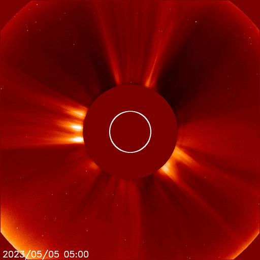 2023/ 5/ 6 10:20 更新 M2.1の中規模フレアが発生しました。太陽風の乱れが到来しています。 担当 篠原 昨夕、5日16時半(世界時5日7時半)に、 太陽の中心部北東側(左上)の3296黒点群で、 M2.1の中規模フレアが発生しました。 3296群では、4日のM3.9に続くMフレアです。 その直前に、左側の3297群でC9.5と Mクラスに近い小規模フレアが発生しています。 2つのフレアの様子を、 SDO衛星AIA131の動画で紹介します。 さらに、その直前の5日15時(世界時5日6時)頃には、 東端(左端)でプロミネンス噴出が発生しています。 GOES衛星SUVI 304の動画を掲載します。 太陽の左に向かって、コロナが大きく噴き出しています。 これらの活動により、CME(コロナ質量放出)が発生しています。 SOHO衛星LASCO C2、C3の動画を見ると、 初めにプロミネンス噴出によるCMEが太陽の左側に、 続いて、M2.1フレアによるCMEが 太陽を丸く囲むように広がっています。 この噴出による太陽風の乱れは、 NOAA/SWPCの予報では、 明後日の夜、8日21時(世界時8日12時)頃に 到来する可能性があるとのことで、 地球まで3日くらいかかると考えている様です。 注目して下さい。 3296群では、 その後、M1.2の中規模フレアが発生しています。 また、X線グラフの最後のC9.7の小規模フレアは、 南西の端(右下)で発生しています。 太陽風は、DSCOVR衛星の速度データがやや不安定なので、 ACE衛星のグラフも掲載します。 これらを見ると、速度は400km/秒から320km/秒へさがり、 低速になっています。 磁場強度は、3〜4nTとやや弱い状態でした。 そして、DSCOVR衛星のグラフの最後、 6日9時半(世界時6日0時半)に、 速度が320km/秒から400km/秒へ、 磁場強度が3nTから12nTヘ、 急に強まる変化が発生しています。 対応する現象がどれか分からないのですが、 CMEによる太陽風の乱れが到来した様です。 磁場の南北成分は、-12nTと南向きに大きく強まっています。 この状態が続くと、磁気圏の活動が強まります。 速度は平均的な状態なので、 激しい乱れにはならないと思います。 この後の太陽風の変化に注目して下さい。