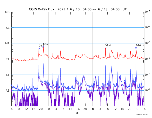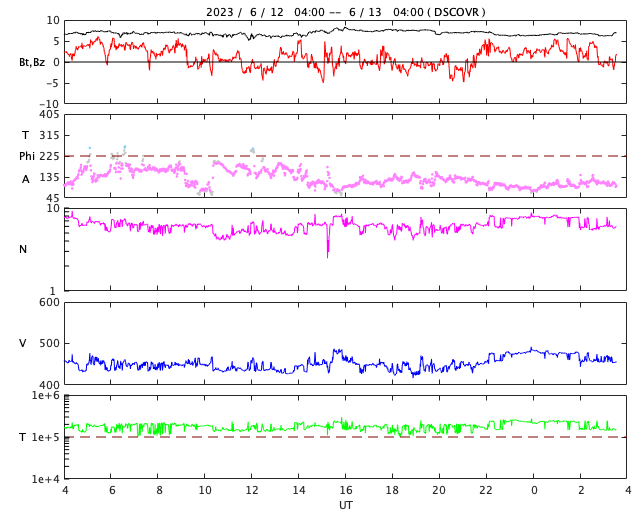 2023/ 6/13 12:49 更新 太陽風の速度は少し高めです。磁気圏は穏やかです。 担当 篠原 昨日紹介したフィラメント噴出による CME(コロナ質量放出)の様子を、 SOHO衛星LASCO C2、C3の動画で紹介します。 太陽の上に向かってガスが飛び出しています。 地球への影響はないでしょう。 太陽では、北西(右上)の3330黒点群でC5.2、 南西(右下)の3327群でC5.1など、 Cクラスの小規模フレアが度々発生しています。 しかし、あまり活動的な印象はありません。 東端(左端)の向こう側の南北に、活動的な領域がある様です。 どの様な領域が現れるでしょうか。 太陽風は、昨日のニュース以降も 速度は450km/秒の状態が続いています。 磁場強度は、7nT前後で推移しています。 変化としては小幅ですが、 27日周期の図を見ると、11日以降、 太陽風が少し強まった状態になっている様です。 磁気圏は穏やかで、 AE指数はほとんど変化のない状態です。 SDO衛星AIA193では、 中心部に小ぶりのコロナホールが見えています。 広がりが小さいので影響も小さくなりそうですが、 3日後くらいの太陽風に強まりが見られるかもしれません。 ![]() 太陽の北側のフィラメント噴出によるCMEの様子。 (c) SOHO衛星LASCO C2、C3 (ESA & NASA)、(動画加工 : 宇宙天気ニュース) ![]() SDO衛星のAIA193カメラによる太陽コロナの様子 (c) SDO (NASA) ![]() SDO衛星による太陽の可視光写真。マウスの矢印を写真に重ねると、黒点番号付きの写真に切り替わります。 (c) SDO (NASA) ![]() GOES衛星の太陽X線強度。赤・橙 = 0.1〜0.8 nm、青・紫 = 0.05〜0.4 nm (c) データ:NOAA/SWPC、作図:宇宙天気ニュース ![]() DSCOVRが観測した太陽風の磁場(黒線は全体の強度、赤線は南北成分) 磁場の向き、プラズマの密度、速度、温度 (c) データ:NOAA/SWPC、作図:宇宙天気ニュース ![]() AE指数(速報値) 下段のAEグラフの値が高くなると、オーロラ活動が活発化しています。 (c) 京都大学WDC ![]() ![]() 27日の太陽周期に合わせた図 太陽が同じ面を地球に向けていた27日前の変化から、今後を予想することができます。 (c) 作図:宇宙天気ニュース