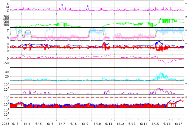 2023/ 7/10 14:15 更新 M2.3の中規模フレアが発生しました。太陽風は低速になっています。 担当 篠原 太陽の南西側(右下)の3358黒点群付近で、 10日12時半(世界時10日3時半)に M2.3の中規模フレアが発生しました。 太陽の南西側では、 昨夜から3368黒点群が新しく現れて大きくなり、 それとともに、周囲の3358群、3366群で Cクラスの小規模フレアが発生する様になっていました。 今朝以降のこの領域の活動の様子を SDO衛星AIA131の動画で紹介します。 最後に明るく輝いているのが、M2.3のフレアです。 引き続き注目してください。 太陽風は、DSCOVR衛星の速度のグラフが後半で乱れているので、 ACE衛星のグラフも掲載します。 こちらを参照すると、370km/秒とやや低速の状態から、 今朝くらいから350km/秒へ下がって、 低速の風になっている様です。 磁場強度は、5nTと平均的な状態です。 磁気圏は概ね静穏で、 AE指数は、小規模の変化が見られる程度です。 SDO衛星AIA193では、 南半球のコロナホールは南西の端に近付いています。 特に影響のないままでしょうか。