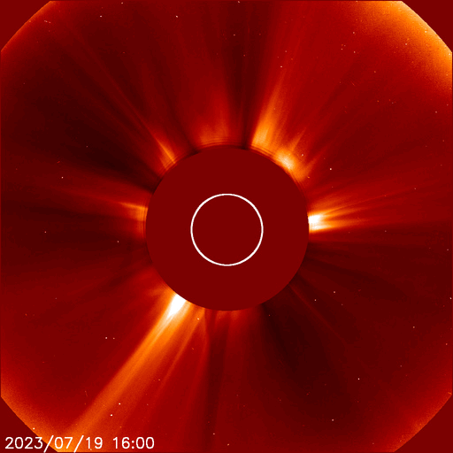 2023/ 7/20 16:28 更新 太陽風は平均的な状態です。M3.8の中規模フレアが発生しています。 担当 篠原 太陽風の速度は、450km/秒から400km/秒へ少し下がっていますが、 平均的な状態が続いています。 磁場強度は5nTと平均的な状態です。 磁場の南北成分は、北寄りで小さく変化しています。 磁気圏は穏やかで、AE指数はほとんど変化のない状態です。 18日のニュースでお知らせしたM5.7フレアの時に発生した CME(コロナ質量放出)による太陽風の乱れが近付いていると思われます。 今夜から明日にかけて、太陽風の変化に注目して下さい。 磁場が南向きに強まると、オーロラなどの磁気圏活動が活発になります。 太陽では、南西の端(右下)に沈んだ3363黒点群で、 今日未明、20日2時(世界時19日17時)に M3.8の中規模フレアが発生しました。 SDO衛星AIA131の動画を掲載します。 全体が見えていないので、 本当の規模はこれよりも大きかった可能性があります。 そして、今朝、20日7時半(世界時19日22時半)に、 北西の端近く(右上)でフィラメント噴出が発生しています。 GOES衛星SUVI 304の動画を掲載します。 これらにより、太陽の右と右上に向かって CME(コロナ質量放出)が発生しています。 SOHO衛星LASCO C2、C3の動画を掲載します。 地球に対して横向きの噴出なので、影響はありません。 発生が1週間ほど早かった場合は、 地球にも影響がやってきたのではないでしょうか。 X線グラフは、3363群が見えなくなった影響もありますが、 変化が少なくなっています。 可視光写真では、黒点があちこちに見えています。 次に活動が強まるのはどの領域でしょうか。