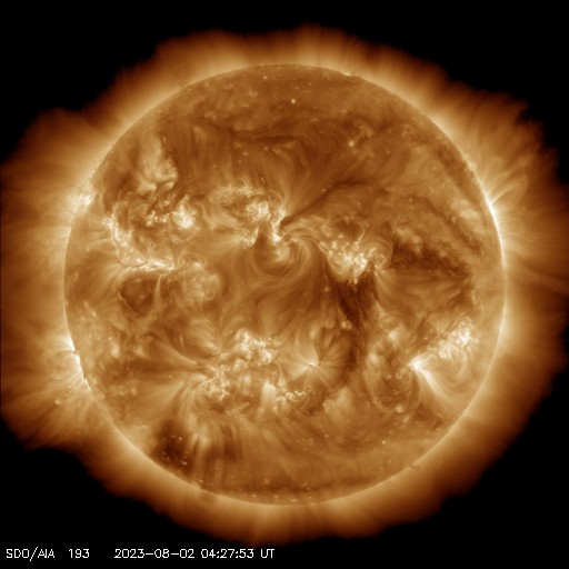 2023/ 8/ 2 14:43 更新 太陽風磁場の強まりが到来しています。磁気圏は穏やかです。 担当 篠原 太陽風は、5nTと平均的な状態だった磁場強度が、 2日1時(世界時1日16時)頃に12nTへ急に強まり、 以降、10nT前後で推移しています。 速度は目立った変化はなく、 380〜400km/秒と平均的な状態です。 7月30日のニュースでお知らせした CME(コロナ質量放出)による太陽風の変化が 予報よりも半日ほど遅くなりましたが、 やって来たのかもしれません。 その場合、太陽から地球まで4日弱かかったことになります。 現在の太陽風の速度を考えると、妥当な範囲だと思います。 磁場の南北成分は、グラフの中盤で弱い南寄りになり、 磁場が強まった後は、北寄りの傾向になっています。 オーロラの活動度を示すAE指数のグラフは、 中盤で500nTの変化がしばらく続いていますが、 その後は変化がなくなっています。 現在の磁気圏は穏やかです。 太陽風磁場の強まりはどのくらい続くでしょうか。 太陽は、南西(右下)の3380黒点群の活動が目立っていて、 昨日のニュース以降、 M3.6、M1.5、M1.4、M1.0と 中規模フレアが発生しています。 このため、X線グラフは変化が頻繁に起きています。 太陽の南東の端(左下)の向こう側にも 活動的な領域があるようです。 この後、どの様な黒点が現れるでしょうか。 ![]() 3080黒点群で発生するフレアの様子。 (c) GOES衛星SUVI 131 (NOAA)、(動画加工 : 宇宙天気ニュース) ![]() SDO衛星のAIA193カメラによる太陽コロナの様子 (c) SDO (NASA) ![]() SDO衛星による太陽の可視光写真。マウスの矢印を写真に重ねると、黒点番号付きの写真に切り替わります。 (c) SDO (NASA) ![]() DSCOVRが観測した太陽風の磁場(黒線は全体の強度、赤線は南北成分) 磁場の向き、プラズマの密度、速度、温度 (c) データ:NOAA/SWPC、作図:宇宙天気ニュース ![]() AE指数(速報値) 下段のAEグラフの値が高くなると、オーロラ活動が活発化しています。 (c) 京都大学WDC ![]() ![]() 27日の太陽周期に合わせた図 太陽が同じ面を地球に向けていた27日前の変化から、今後を予想することができます。 (c) 作図:宇宙天気ニュース