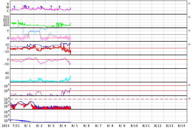 2023/ 8/ 5 12:41 更新 太陽風磁場が強まり、磁気圏の活動も強まっています。 担当 篠原 10nTに強まっていた太陽風の磁場が、さらに強まっています。 初めの変化は、昨夕、4日16時(世界時4日7時)で、 10nTから15nTへ急に上昇しています。 その後、半日近くこの状態が続き、 今朝くらいから10nTへ一旦下がったのですが、 5日11時(世界時5日2時)に二つ目の強まりが到来して、 磁場強度は23nTへ変化しています。 太陽風の速度は、400km/秒と平均的な状態が続いていて、 二つ目の変化で450km/秒に上昇していますが、 変化としては小幅です。 8月11日のニュースで紹介した 1日未明のフィラメント噴出により発生した CME(コロナ質量放出)の乱れが到来したのでしょうか。 その場合、到来まで4日半かかったことになります。 太陽風磁場の南北成分は、 太陽風のグラフの中ほど、 今日に入った頃から南向きに強まり始め、 -10nTに達する大きい変化が続いています。 このため、磁気圏の活動は活発になっていて、 AE指数は、1000nTに達する大きい変化が 連続的に発生しています。 Dst指数の速報値は-60nTまで変化していて (Dst指数は、マイナス方向に変化が大きくなります)、 この後、さらに変化が大きくなる可能性があります。 太陽は、北西(右上)の3386黒点群で、 M1.9の中規模フレアが発生しています。 また、グラフの最後のC9.7の小規模フレアは、 南西の端(右下)に沈んだ3380群で発生した様です。
