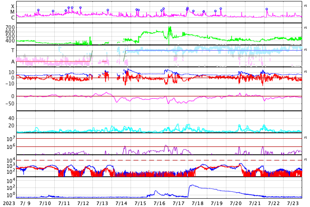 2023/ 8/10 14:35 更新 太陽風は低速になっています。太陽は比較的穏やかです。 担当 篠原 太陽風の速度は400km/秒台を割り、 最後は370km/秒と低速になっています。 磁場強度は、小幅ですが6nTから4nTへ下がっています。 平均的な状態です。 磁場の南北成分は、弱い南寄りになっています。 磁気圏では弱い活動が続いていて、 AE指数は300nT程度の変化が起きています。 太陽は、中心部南西側の3394黒点群でC4.0、 南西の端に達した3398群でC5.4の 小規模フレアが発生しています。 X線グラフの変化は少なくなっていて、 太陽は比較的落ち着いた状態です。 深夜、10日1時(世界時9日16時)に、 太陽の右下側に広がるCME(コロナ質量放出)が発生しました。 太陽のこちら側では特に変化が起きていないので、 向こう側で発生した現象の様です。 台風は通過して、今日の天気は落ち着いています。 休校が前期最後にぶつかってしまったため、 今日はとても慌ただしい状態です。