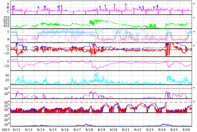 GOES衛星の太陽X線強度。赤・橙 = 0.1〜0.8 nm、青・紫 = 0.05〜0.4 nm (c) データ:NOAA/SWPC、作図:宇宙天気ニュース ![]() | |||||||||||||||||||||||||||||||||||||||||||||||||||||||||||||||||||||||||||||||||||||||||||||||||||||||||||||||||||||||||||||||||||||||||||||||||||||||||||||||||||||||||||||||||||||||||||||||||||||||||||||||||||||||||||||||||||||||||||||||||||