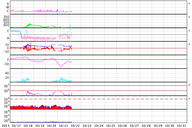 GOES衛星の太陽X線強度。赤・橙 = 0.1〜0.8 nm、青・紫 = 0.05〜0.4 nm (c) データ:NOAA/SWPC、作図:宇宙天気ニュース ![]() | ||||||||||||||||||||||||||||||||||||||||||||||||||||||||||||||||||||||||||||||||||||||||||||||||||||||||||||||||||||||||||||||||||||||||||||||||||||||||||||||||||||||||||||||||||||||||||||||||||||||||||||||||||||||||||||||||||||||||||