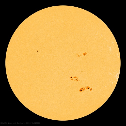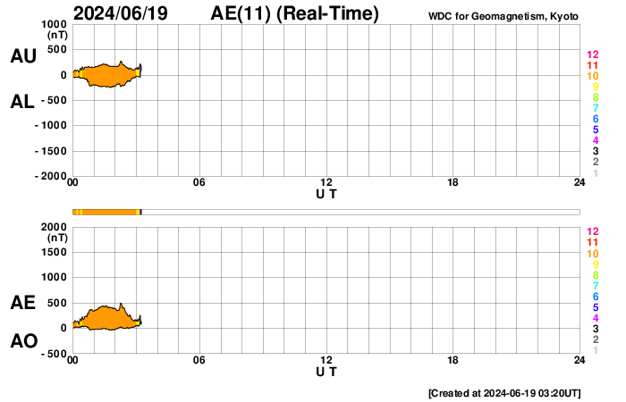 2024/ 6/19 12:37 更新 太陽風は高速の状態が続いています。中規模フレアが発生しています。 担当 篠原 太陽風の速度は、 580km/秒から550km/秒へ少し下がっていますが、 高速の状態が続いています。 磁場強度は、7nTから3nTへ下がり、 やや弱くなっています。 高速風の領域は、後半に入ったのかもしれません。 磁場の南北成分は、 0nT付近で南寄りになったり、北寄りになったりしています。 AE指数も、500nT程度の変化が発生したり静かになったりと、 太陽風磁場とともに変化しています。 SDO衛星AIA193では、 北半球側のコロナホールが太陽の中心線上に広がっています。 緯度が高めですが、 明後日くらいから太陽風に影響が見られるかもしれません。 速度の高まりに注目して下さい。 太陽は、南西側(右下)の3712黒点群で、 昨夜、18日20時と21時(世界時18日11時と12時)に、 M2.4とM1.1の中規模フレアが発生し、 その前後でCクラスの小規模フレアが発生しています。 活動的な状態は続いているので、引き続き注目してください。 また、今日未明、19日2時(世界時18日17時)頃に、 太陽の北西側(右上)と北西の端で、 フィラメント噴出とプロミネンス噴出が発生しました。 GOES衛星SUVI 304の動画を掲載します。 どちらも上寄りに噴出が発生していて、 SOHO衛星LASCO C2、C3でも 右上に向かってCME(コロナ質量放出)が広がっています。 地球への影響はなさそうです。