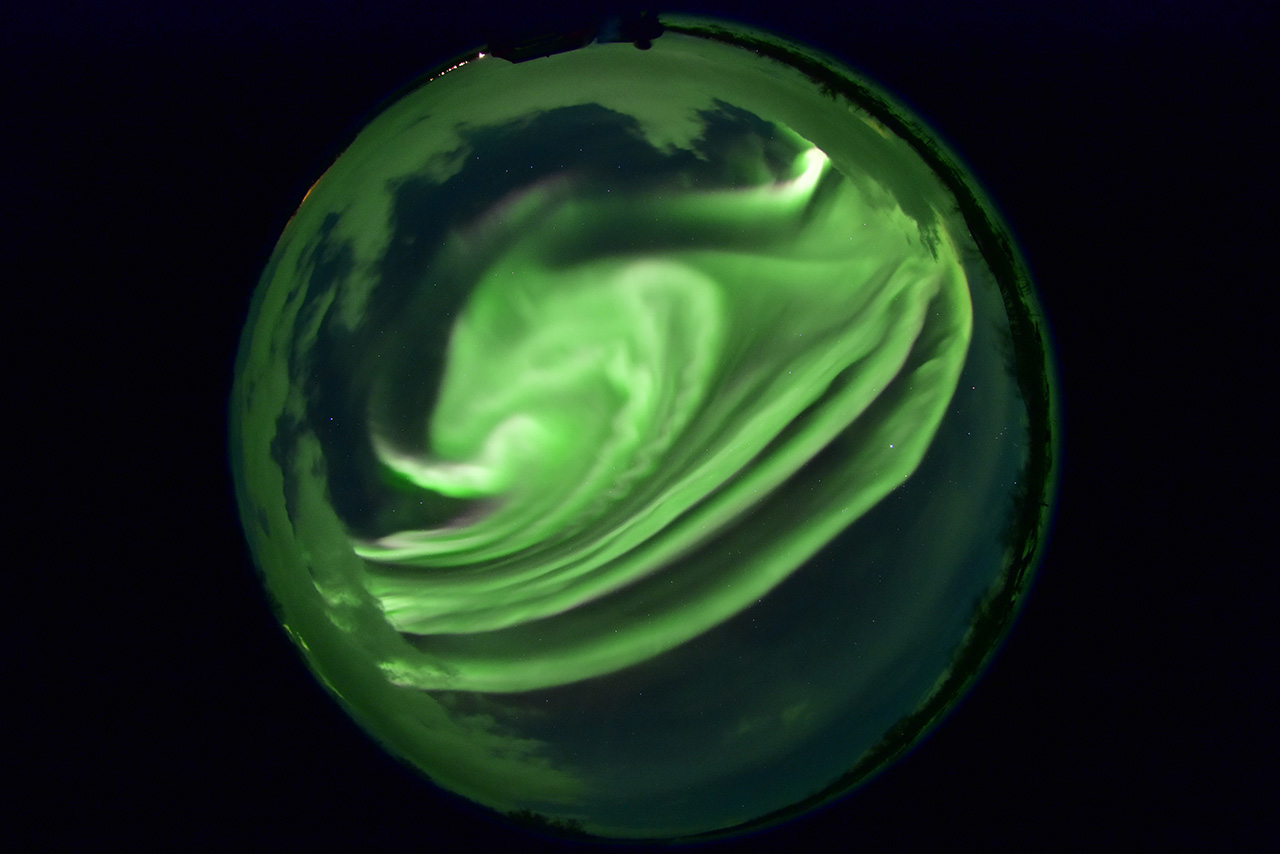 2024/12/27 12:04 更新 太陽風は速度が下がり、低速になっています。アイスランドのオーロラをどうぞ。 担当 篠原 藤井哲也さんによる、 アイスランドのオーロラ写真を紹介します。 昨日、一昨日の写真と同じ、23日夜に撮影されたオーロラです。 今日は魚眼レンズによる全天の写真ですが、 空を大きくまたいで、オーロラの光の帯が複雑に広がっています。 昨日の写真の約30分後の撮影ですが、 23日のAE指数を見ると、 今日の写真の時間帯にかけて値が次第に大きくなっています。 アイスランドの空でも、 この時間帯にかけてオーロラが次第に強まっていた様です。 太陽風は、速度が400km/秒から350km/秒へゆっくりと下がり、 低速の風に変わっています。 磁場強度は、3〜4nTとやや弱い状態です。 注目していたCME(コロナ質量放出)による太陽風の乱れは、 今のところ到来していません。 速度があまり高まっていなくて、到来が遅れているのかもしれません。 もうしばらく注目して下さい。 太陽風磁場の南北成分は、0nT付近か弱い北寄りです。 磁気圏は穏やかで、AE指数はほとんど変化のない状態です。 太陽は、昨日の2つのMフレアの後は 活動が少なくなりましたが、 今日未明、27日3時半(世界時26日18時半)に、 南東の端近く(左下)の領域でC9.6、 今朝、27日9時半(世界時27日0時半)に、 北東(左上)の3938黒点群でC9.0と、 大きめの小規模フレアが発生しています。