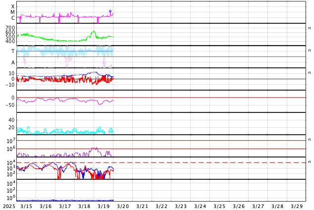 GOES衛星の太陽X線強度。赤・橙 = 0.1〜0.8 nm、青・紫 = 0.05〜0.4 nm (c) データ:NOAA/SWPC、作図:宇宙天気ニュース ![]() | ||||||||||||||||||||||||||||||||||||||||||||||||||||||||||||||||||||||||||||||||||||||||||||||||||||||||||||||||||||||||||||||||||||||||||||||||||||||||||||||||||||||||||||||||||||||||||||||||||||||||||||||||||||||||||||||||||||||||||||||||||||||||||||||||||