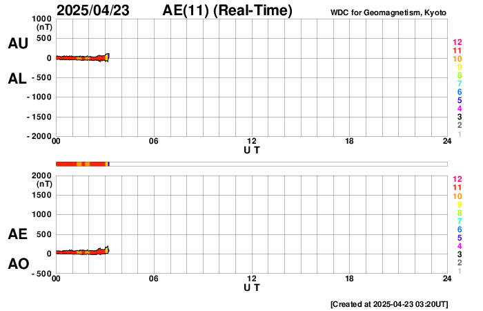 2025/ 4/23 12:35 更新 高速の太陽風が続いていますが、速度は少し下がっています。ニュージーランドのオーロラをどうぞ 担当 篠原 ニュージーランド南島クィーンズタウンの米戸 実さんより、 高速太陽風が始まった、21日夜のオーロラの写真をいただきました。 現地21日21〜22時(世界時21日9〜10時)頃の撮影で、 ACE衛星のデータでは、この3時間程前から太陽風の速度が上がり始め、 500〜600km/秒に高まった頃です。 太陽風の磁場も南向きに変化して、 AE指数では、500〜800nTの中規模の活動が続く様になっていました。 1枚目の写真は、中心に小マゼラン雲が見えていて、 その下方にオーロラの光の柱がいくつも見えています。 この後、オーロラが終息気味になったそうで、 その状況で撮影したのが、2枚目、3枚目とのことです。 それでも、2枚目は、見事な赤色で、 2つのマゼラン雲と、その右にカノープスが輝いています。 3枚目は天の川との組み合わせですが、 この様にオーロラと天の川を同じくらいの明るさで写せるのは、 オーロラがある程度弱まったからだそうで、 オーロラが強い時は明るさに差があり過ぎて、 天の川に合わせるとオーロラが白飛びしてしまうとのことです。 日本から見える天の川は左下の方だけで、 途中から上は南に行かないと見ることができない領域です。 どの写真も湖面の赤い色がとてもきれいです。 写真全体が真っ赤に見えています。 素晴らしい写真をありがとうございます。 太陽風の速度は、今朝早くまでは600km/秒台を保っていましたが、 その後一段低下して、現在は550km/秒です。 高速の状態は続いています。 太陽風の磁場強度は、5nT前後と平均的な状態です。 磁場の南北成分は、0nT付近で推移して、 南北の変化が少し目立たなくなっています。 磁気圏の活動はやや落ち着いていて、 AE指数は、500nTの中規模の変化が数回発生していますが、 その間に、穏やかな状態もしばらく続いています。 SDO衛星AIA193では、 南半球でコロナホールが東西に大きく広がっています。 太陽風の強まりは、この後も1週間近く続きそうです。 太陽は、昨夜、22日19時(世界時22日10時)に、 北西の端(右上)の少し向こう側で、 M1.3の中規模フレアが発生しました。 目立ったフレアの発生は、この程度です。