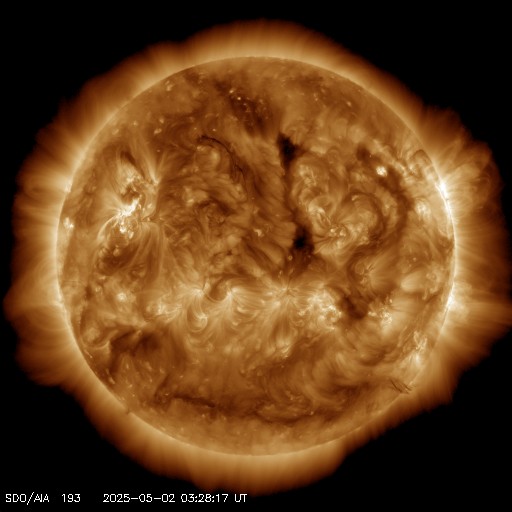 2025/ 5/ 2 12:58 更新 太陽風の速度が高まっています。磁気圏の活動も強まっています。 担当 篠原 太陽風の速度は、今朝くらいから高まり始め、 450km/秒と平均的な状態から、 現在は550km/秒付近に高まっています。 磁場強度は、10nT前後と強まった状態です。 27日周期の図の前周期に見られた速度の高まりが 今回も回帰してきた様です。 前周期の太陽風は、速度の高まりは1週間ほど続きました。 今回はどうなるでしょうか。 太陽風磁場の南北成分は、南寄りの傾向になっています。 磁気圏の活動は活発になっていて、 AE指数は、1000nTに達する大きい変化が度々発生しています。 現在は速度も高まっているので、今後の推移に注目して下さい。 太陽は、X線グラフでは目立った変化がなく、 穏やかになっています。 可視光写真では、 北東(左上)に4079黒点群が大きく見えていますが、 現在は落ち着いています。
