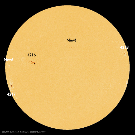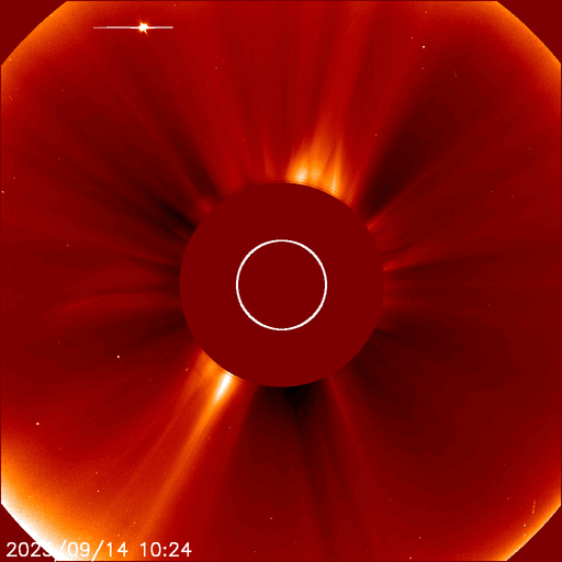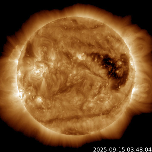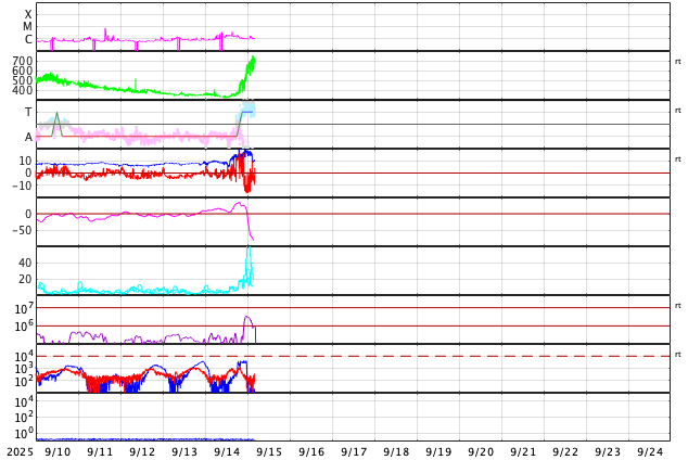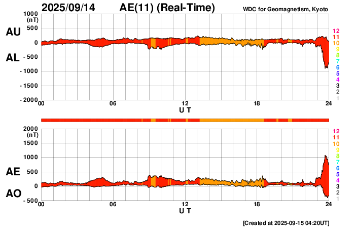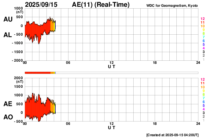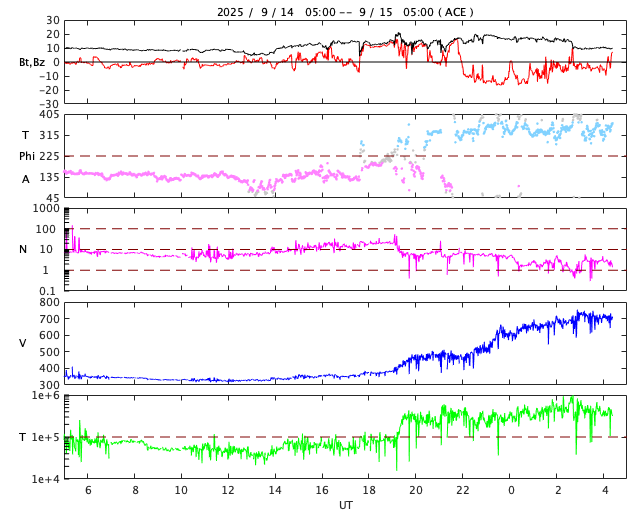 2025/ 9/15 13:33 更新 太陽風の速度は700km/秒に高まっています。磁気圏の活動も強まっています。 担当 篠原 コロナホールによる高速の太陽風が始まりました。 太陽風の速度は、昨日以降350km/秒と低速の状態が続いていましたが、 今朝、15日4時(世界時14日19時)頃から上昇を始め、 15日8時(世界時14日23時)には500km/秒に達し、 その後も上昇が続いて、現在は700km/秒まで高まっています。 磁場強度は、10nTから18nTへ強まり、 現在は10nTへ下がっています。 値としては、強まった状態が続いています。 磁場の南北成分は、速度が高まり始めた頃は北向きに強まりましたが、 その後南向きに切り替わり、-10nT程度の変化が4時間程続きました。 現在は変化は少し小さくなっていますが、 -5nTと南向きの状態は続いています。 太陽風速度の高まりと磁場の南向きの強まりの影響で、 磁気圏の活動は、今朝以降活発になっています。 AE指数は、初めは小さい変化が見られるだけでしたが、 グラフの後半では、1000nTに達する大きい変化が続いています。 極域では活発なオーロラが発生しているのではないでしょうか。 SDO衛星のページが停止しているので、 GOES衛星SUVI 195の太陽コロナ写真を掲載しています。 コロナホールは、全体が太陽の西側に進んでいます。 東西方向(横方向)の広がりから考えると、 高速の太陽風は5日間くらいになるかもしれません。 この後の変化に注目して下さい。 太陽は、南東の端(左下)の4217黒点群で、 C3.7の小規模フレアが発生しています。 また、昨夜、14日21時(世界時14日12時)頃に、 太陽の左上へ広がるCME(コロナ質量放出)が発生しています。 太陽の向こう側で発生した現象です。