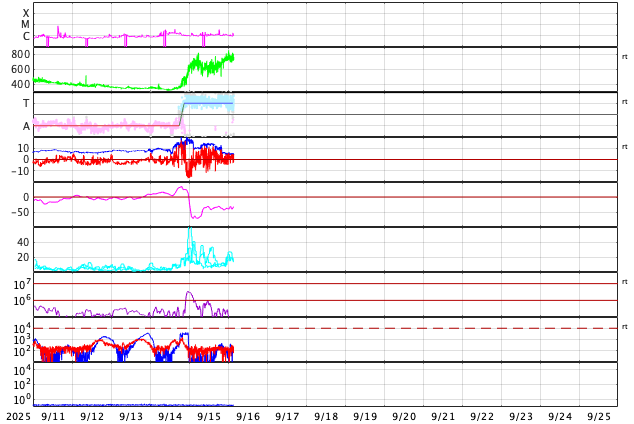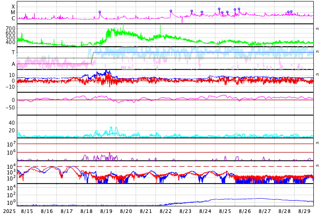 GOES衛星の太陽X線強度。赤・橙 = 0.1〜0.8 nm、青・紫 = 0.05〜0.4 nm (c) データ:NOAA/SWPC、作図:宇宙天気ニュース ![]() | |||||||||||||||||||||||||||||||||||||||||||||||||||||||||||||||||||||||||||||||||||||||||||||||||||||||||||||||||||||||||||||||||||||||||||||||||||||||||||||||||||||||||||||||||||||||||||||||||||||||||||||||||||||||||||||||||||||||||