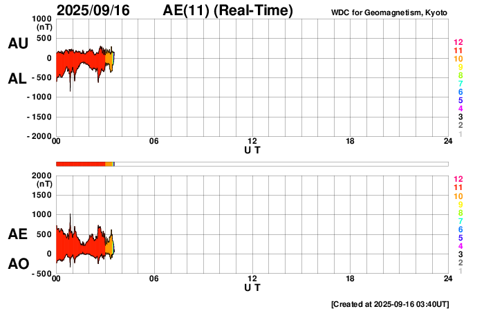 2025/ 9/16 12:46 更新 太陽風の速度は750km/秒に高まっています。磁気圏も活動的です。 担当 篠原 太陽風の速度は、昨夕に600km/秒へ下がりましたが、 今日に入る頃から再び上昇して、 今朝以降、750km/秒と昨日よりも高速になっています。 一方、磁場強度は、10nTから15nTへ強まりましたが、 今朝早くに5nTへ下がり、平均的な値に戻っています。 磁場の南北成分は、 昨日のニュース以降は比較的北寄りになっています。 南向きの変化も発生しているので、 磁気圏の活動は強まっていますが、 AE指数を見ると、500〜1000nTの中規模の変化が続く程度です。 速度の高まりと比べると、大きな変化にはなっていません。 GOES衛星SUVI 195の太陽コロナ写真では、 コロナホールは西の端(右端)に達しています。 高速の太陽風はどのくらい続くでしょうか。 注目して下さい。 太陽は穏やかで、 X線グラフは、C3.5の小規模フレアが発生した程度です。 可視光写真では、黒点が少し増えています。 ![]() GOES衛星SUVI 195カメラによる太陽コロナの様子 (c) GOES衛星SUVI 195 (NOAA) ![]() SDO衛星による太陽の可視光写真。SOHO衛星のWebページより取得しました。 (c) SDO (NASA) ![]() ACEが観測した太陽風の磁場(黒線は全体の強度、赤線は南北成分) 磁場の向き、プラズマの密度、速度、温度 (c) データ:NOAA/SWPC、作図:宇宙天気ニュース ![]() AE指数(速報値) 下段のAEグラフの値が高くなると、オーロラ活動が活発化しています。 (c) 京都大学WDC ![]() ![]() 27日の太陽周期に合わせた図 太陽が同じ面を地球に向けていた27日前の変化から、今後を予想することができます。 (c) 作図:宇宙天気ニュース
