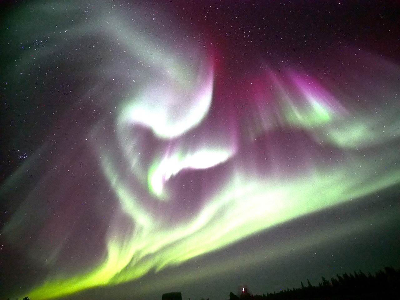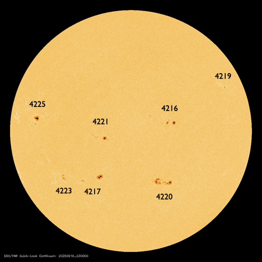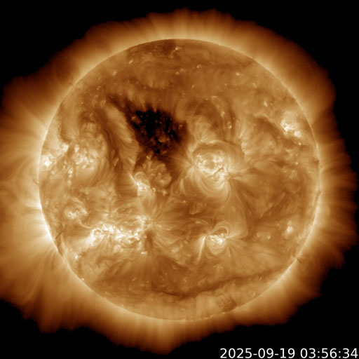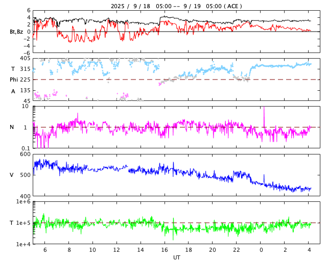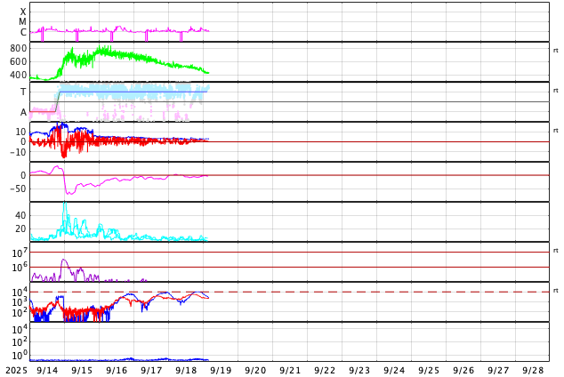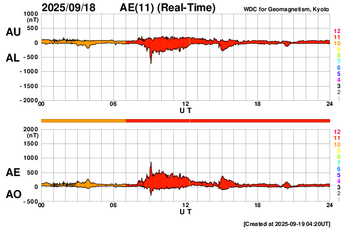 2025/ 9/19 13:28 更新 太陽風は平均的な速度に戻っています。イエローナイフのオーロラをどうぞ。 担当 篠原 カナダ・イエローナイフに滞在中の 景山植光さんよりお送りいただいたオーロラ写真の続きを紹介します。 1、2枚目は昨日の写真の数分後の撮影で、 昨日のオーロラをそのまま東の地平線へ追いかけて行って撮影した様です。 昨日から続くオーロラの複雑な動きが印象的です。 3枚目は30分ほど後の撮影です。 高い空から降り注ぐような赤いオーロラの帯がとてもきれいです。 昨日のAE指数のグラフを見ると、 400nTくらいの変化が3時間程続いています。 素晴らしい夜だっただろうと思います。 とてもきれいな写真をどうもありがとうございます。 太陽風は、昨日のニュースの後も速度の低下が続き、 今日未明には500km/秒台を割り、 現在は430km/秒と平均的な速度に戻っています。 磁場強度は3nTとやや弱い状態です。 27日周期の図を見ると、今回の高速太陽風は4日ほど続きました。 27日前の前周期の変化と比較すると、 到来が半日ほど早まって、継続時間は同じくらいになっています。 次の回帰はどうなるでしょうか。 太陽風磁場の南北成分は、 グラフの前半は南向きに変化していて、 AE指数では500nTの中規模の変化が発生しています。 その後は北寄りに変わり、磁気圏は穏やかになっています。 GOES衛星SUVI 195では、 北半球のコロナホールが太陽の中心線に達しています。 3日後の22日くらいから太陽風の速度が高まる可能性があります。 太陽は穏やかな状態が続いています。 南西(右下)の4220黒点群でC3.6、 南東(左下)の4223群でC2.9の小規模フレアが発生した程度です。