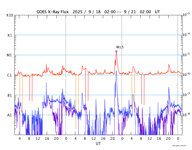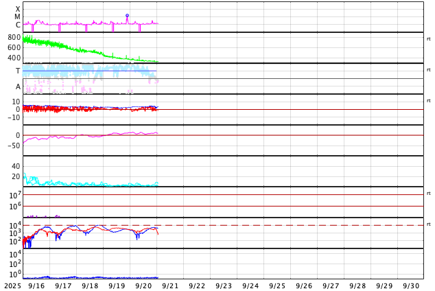 GOES衛星の太陽X線強度。赤・橙 = 0.1〜0.8 nm、青・紫 = 0.05〜0.4 nm (c) データ:NOAA/SWPC、作図:宇宙天気ニュース ![]() | ||||||||||||||||||||||||||||||||||||||||||||||||||||||||||||||||||||||||||||||||||||||||||||||||||||||||||||||||||||||||||||||||||||||||||||||||||||||||||||||||||||||||||||||||||||||||||||||||||||||||||||||||||||||||||||||||||||||||||||||||||||||||||||||||||