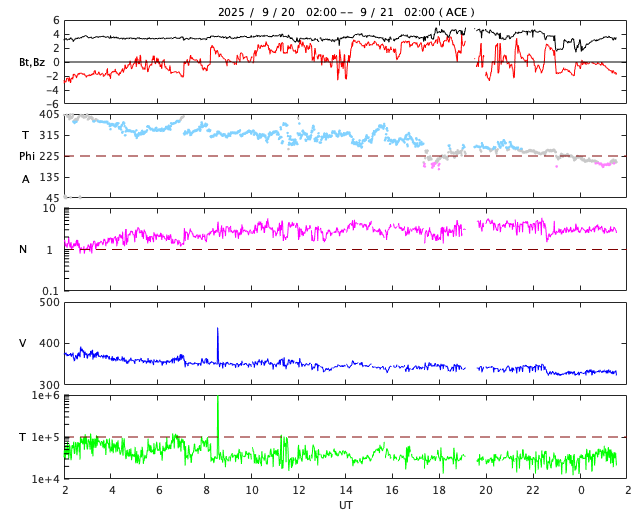 2025/ 9/21 10:47 更新 太陽風は更に低速になっています。磁気圏も穏やかです。 担当 篠原 太陽風の速度は370km/秒から330km/秒へ下がり、 更に低速になっています。 磁場強度は、3〜5nTで小さく変化しています。 平均的な状態です。 磁場の南北成分は、やや北寄りで推移しています。 速度が下がっていることもあり磁気圏は穏やかで、 AE指数はほとんど変化のない状態です。 GOES衛星SUVI 195では、 コロナホールは北西側(右上)に進んでいます。 明日くらいから、 この領域の影響で太陽風の速度が高まりそうです。 27日周期の図を見ると、 前周期はコロナホールが小さかったためか、 速度の高まりは来ていません。 今回はどの様になるでしょうか。 太陽は穏やかな状態です。 南西(右下)の4220黒点群でC3.4の小規模フレアが発生した程度です。 ![]() GOES衛星SUVI 195カメラによる太陽コロナの様子 (c) GOES衛星SUVI 195 (NOAA) ![]() SDO衛星による太陽の可視光写真。SOHO衛星のWebページより取得しました。 (c) SDO (NASA) ![]() ACEが観測した太陽風の磁場(黒線は全体の強度、赤線は南北成分) 磁場の向き、プラズマの密度、速度、温度 (c) データ:NOAA/SWPC、作図:宇宙天気ニュース ![]() AE指数(速報値) 下段のAEグラフの値が高くなると、オーロラ活動が活発化しています。 (c) 京都大学WDC ![]() ![]() 27日の太陽周期に合わせた図 太陽が同じ面を地球に向けていた27日前の変化から、今後を予想することができます。 (c) 作図:宇宙天気ニュース