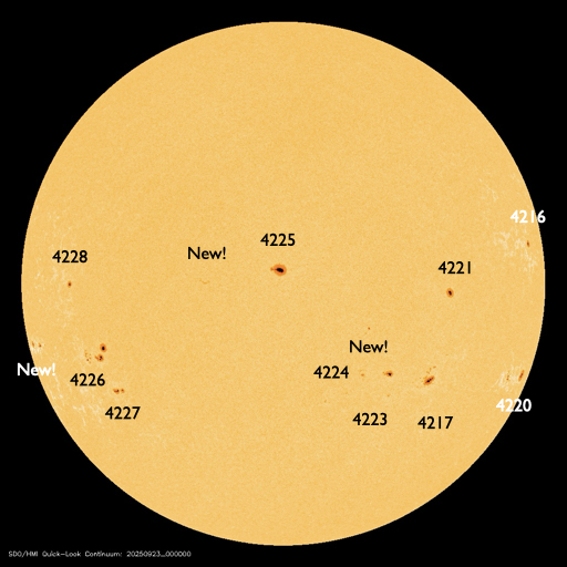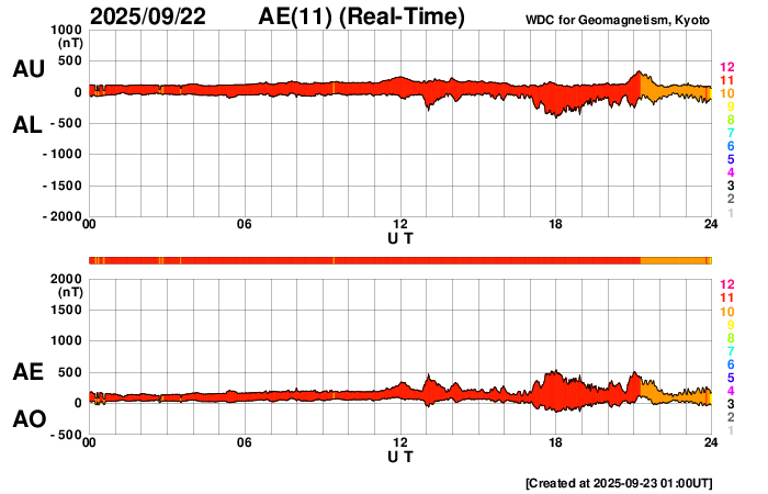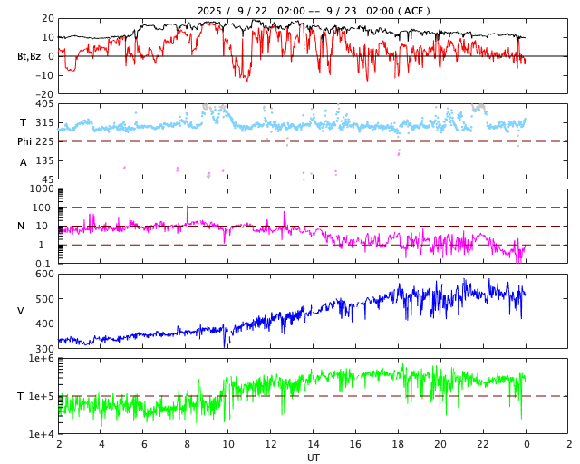 2025/ 9/23 10:02 更新 高速太陽風が到来して、速度は520km/秒に高まっています。 担当 篠原 太陽風は、330km/秒と低速の状態からゆっくりと高まり、 23日3時(世界時22日18時)頃に520km/秒と高速の風になり、 以降、この状態が続いています。 コロナホールの影響が始まった様です。 太陽風の磁場強度は、10nTから18nTへ強まり、 その後下がって、現在は10nTに戻っています。 強まった状態は続いています。 太陽風磁場の南北成分は、北寄りになっています。 このため、磁気圏の活動はあまり強まっておらず、 AE指数は、速度が高まった後に時々500nTの変化が発生する程度です。 GOES衛星SUVI 195では、 コロナホールは北西側(右上)に更に進んでいます。 横の広がりがあまり大きくないので、 高速太陽風は比較的短い期間で終わりそうです。 どのくらい続くか注目して下さい。 昨日のニュースで紹介した、 太陽の右下へ広がるCME(コロナ質量放出)の続きの動画を掲載します。 C2(赤色)に続いて、C3(青色)でもきれいに広がっています。 太陽の可視光写真では、黒点が多く見えています。 フレアは、南東の端(左下)の領域でC4.2の小規模フレア、 その隣の4227群でC3.8の小規模フレアが発生しています。