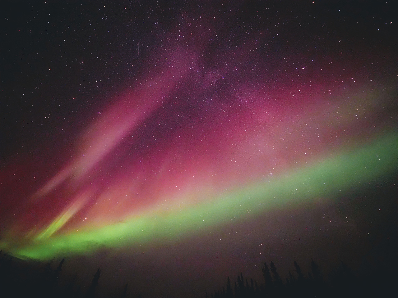 2025/ 9/24 13:04 更新 太陽風は高速の状態が続いています。イエローナイフの21日夜のオーロラをどうぞ。 担当 篠原 景山植光さんより、21日夜にカナダ・イエローナイフで撮影された オーロラの写真をいただきました。 現在の高速太陽風が始まる直前の頃で、 太陽風の速度は330km/秒と低速でしたが、 磁場強度は10nTに強まっていました。 この頃に発生した小規模の活動で、 AE指数では目立った変化は発生していませんでした。 イエローナイフでは見事なオーロラが発生していた様です。 赤と緑の色の組み合わせがとてもきれいです。 2枚目の写真では、右側に夏の大三角や夏の天の川が見えています。 実際の空での広がりが想像できます。 続きの写真を明日、明後日に掲載する予定です。 現在の太陽風は、550km/秒と高速の状態が続いています。 磁場強度は、10nTからゆっくり下がって、 5nTと平均的な値に戻っています。 コロナホールの影響が続いている様です。 磁場の南北成分は、比較的北寄りですが、 南向きにも変化していて、磁気圏の活動はある程度強まっています。 AE指数は、500〜800nTの中規模の変化が度々発生しています。 GOES衛星SUVI 195では、 コロナホールは北西の端(右上)に近付いています。 この後、太陽風の速度は低下に向かいそうです。 太陽は、南西(右下)の4217黒点群でM1.0の中規模フレア、 隣の4224群でC6.8の小規模フレア、 南東(左下)の4226群でC5.5の小規模フレアが発生しています。 特に活動的という印象はありません。