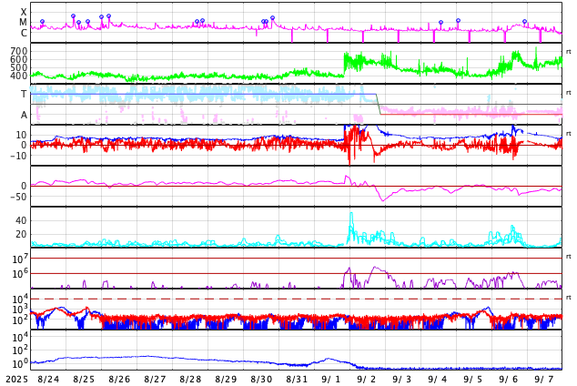GOES衛星の太陽X線強度。赤・橙 = 0.1〜0.8 nm、青・紫 = 0.05〜0.4 nm (c) データ:NOAA/SWPC、作図:宇宙天気ニュース ![]() | |||||||||||||||||||||||||||||||||||||||||||||||||||||||||||||||||||||||||||||||||||||||||||||||||||||||||||||||||||||||||||||||||||||||||||||||||||||||||||||||||||||||||||||||||||||||||||||||||||||||||||||||||||||||||||||||||||||||||||||||||||||||||||||||||||||||||||||||||||