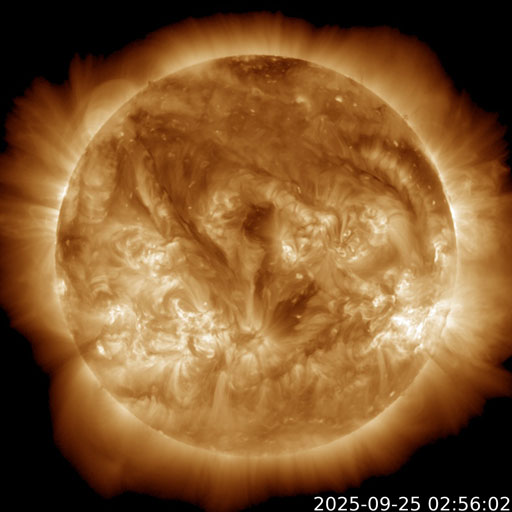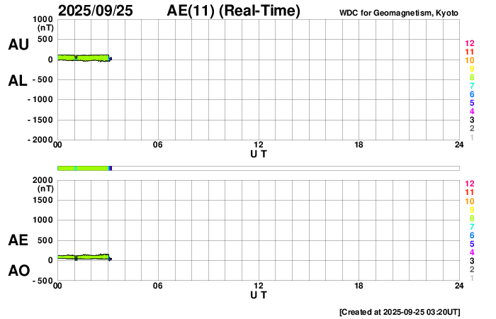 2025/ 9/25 12:27 更新 太陽風は高速ですが、終わりに向かいそうです。イエローナイフの21日夜のオーロラをどうぞ。 担当 篠原 景山植光さんよりお送りいただいた、 21日夜のカナダ・イエローナイフのオーロラ写真の続きです。 昨日の3、4枚目の続きの撮影で、 今日の4枚は、2分ほどの短い間の変化です。 真上から降り注ぐようにオーロラの光が輝いています。 赤と緑、一番下にはピンク色も見えています。 太陽風の状況は、昨日紹介した様に速度は300km/秒台と低速で、 AE指数もほとんど変化が見えていない状態でした。 その中でもイエローナイフの上空でオーロラの活動が起きていた様です。 1〜3枚目では、右端の上側にこと座、中ほどにわし座が見えています。 4枚目では、真ん中の下側にペルセウス座とプレアデス星団が見えています。 とてもきれいな写真を、ありがとうございます。 太陽風は、昨日のニュースの後、速度が500km/秒に下がり、 現在までこの速さが続いています。 高速の状態は続いていますが、 高速太陽風はこの後終わりに向かいそうです。 磁場強度は、5nTで安定しています。 磁場の南北成分は北寄りになっていて、 磁気圏は比較的穏やかです。 AE指数は小規模の変化が見られる程度です。 GOES衛星SUVI 195では、 太陽の中心部にコロナホールは見えていません。 現在の高速風が終わると、 太陽風はしばらく穏やかになりそうです。 太陽は、南西(右下)の4224黒点群で、 昨夕、24日18時半(世界時24日9時半)に、M1.0、 今朝、25日4時(世界時24日19時)に、M1.6と、 中規模フレアが2回発生しています。 また、中心部南東(左下)の4226群で、 C3.5、C5.3、C4.6と小規模フレアが続いています。