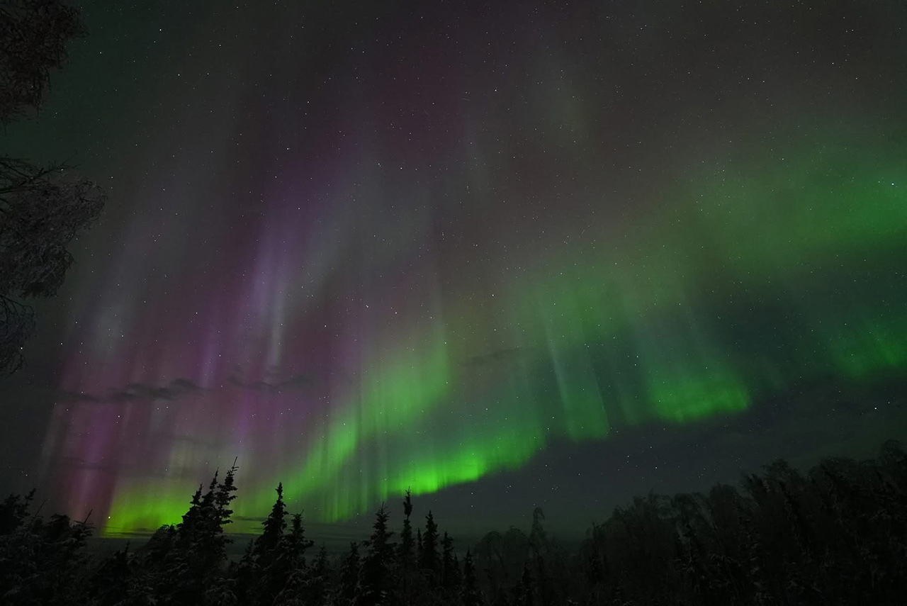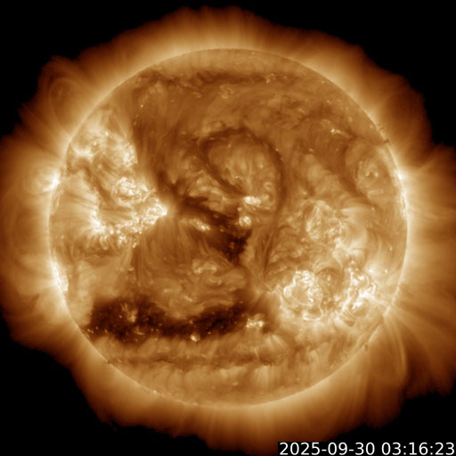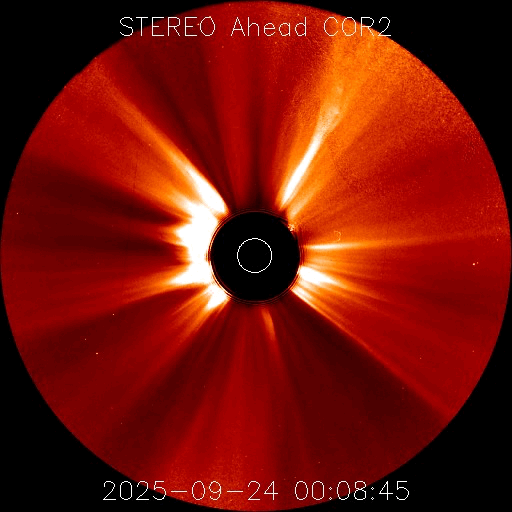 2025/ 9/30 13:12 更新 太陽風磁場が南向きに強まり、磁気圏の活動が激しくなっています。アラスカのオーロラをどうぞ。 担当 篠原 昨日のニュースの後も、 太陽風の磁場強度は12〜14nTと強まった状態が続きました。 磁場の南北成分は、29日10時(世界時29日1時)頃から南向きに強まる様になり、 -5〜 -10nTの状態が、今朝、30日5時(世界時29日20時)頃まで続きました。 太陽風の速度は400km/秒と平均的な状態でしたが、 磁気圏の活動は激しくなり、 AE指数は、1200〜1500nTに達する大きい変化が2回発生し、 その前後の時間帯も500nT程度で推移しています。 Dst指数も、-80nTと中規模の変化になっています。 この時に強まったオーロラの写真を、 アラスカ・フェアバンクスの今野さんよりいただきました。 背景の星空やイエローナイフのライブ動画を参考にすると、 現地28日23時(世界時29日7時)前後ではないかと思います。 今年の秋のアラスカはかなり湿度があって、 天気の悪い日が続いていたそうです。 この日も多少ガスがかかっていたものの、 久々の良いオーロラだったとのことです。 上空に赤いオーロラが高く伸びていて、迫力を感じます。 2枚目の写真では、中央に北斗七星が見えています。 この向きの時に地面から離れた所に見えるのは、高緯度ならではです。 興味深い速報をどうもありがとうございます。 今回の太陽風磁場の強まりの原因は、 4枚目に掲載している24日に発生したCME(コロナ質量放出)かもしれません。 この動画は、太陽を地球よりも右斜めから観測している STEREO Ahead衛星のCOR2によるものです。 太陽の左に向かってCMEがゆっくりと広がっています。 このCMEは、地球から見るとより正対する形になり、 SOHO衛星LASCO C2では、かなり淡い状態で見えています。 ただ、GOES衛星SUVIの画像では、 対応する変化が太陽のコロナでは見つけられず、 どこからどの様に広がったのか分かりませんでした。 この噴出が原因だとすると、4日ほどかけて地球に来たことになり、 タイミングとしては妥当なところだと思います。 現在の太陽風は、速度は430km/秒に少し上がっていますが、 平均的な状態です。 磁場強度は、一旦5nTに下がりましたが、 再び10nTに強まっています。 南北成分は南向きに強まっていて、-14nTに達しています。 磁気圏の活動も強まっていて、 AE指数のグラフの最後で、1300nTの大きい変化が発生しています。 引き続き太陽風や磁気圏活動の変化に注目して下さい。 GOES衛星SUVI 195では、 コロナホールが太陽の中心線に達しています。 3日後くらいから影響が始まりそうです。 太陽は、昨日のニュースを書いていた頃、 29日10時半(世界時29日1時半)に、 北東(左上)の4232黒点群でM3.6の中規模フレアが発生しました。 その後も、29日20〜21時(世界時29日11〜12時)にかけて、 4232群、4236群、4233群で、 M1.0、M1.1、M1.0と中規模フレアが発生し、 今朝、30日10時(世界時30日1時)にも、 4232群でM1.2の中規模フレアが発生しています。 可視光写真では、北東の4236群や、 南西(右下)の4230群周辺で黒点が増えています。 この後もフレアの発生に注目して下さい。