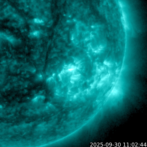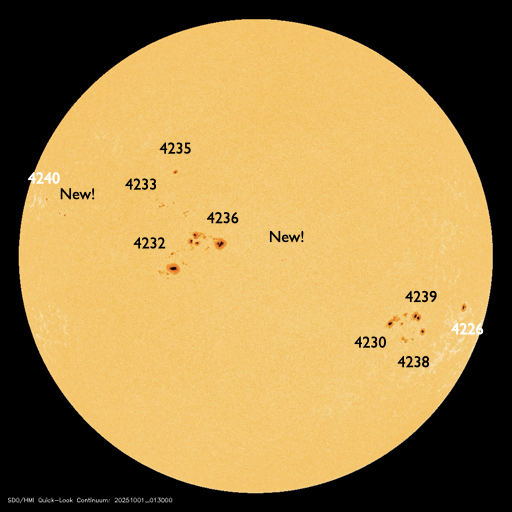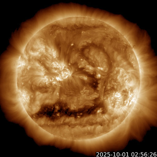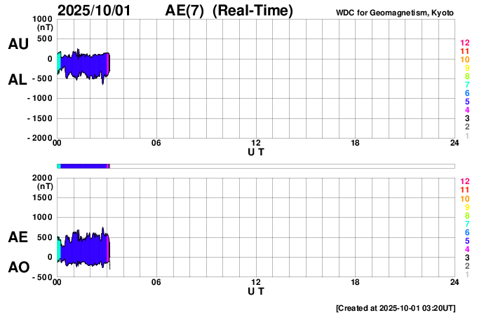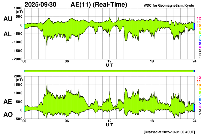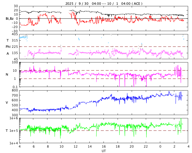 2025/10/ 1 12:31 更新 太陽風の速度が700km/秒に高まっています。磁気圏の活動も活発です。 担当 篠原 昨日のニュースの後、 太陽風の速度は400km/秒と平均的な状態が続きましたが、 磁場強度は17nT程度に強まって行きました。 そして、30日20時(世界時30日11時)になると、 速度が上昇を始めて、高速の状態になり、 今朝、1日9時(世界時1日0時)には、700km/秒に達しました。 コロナホールの影響で 太陽風の速度が高まるのではないかと予想していましたが、 だいぶ早くやって来ました。 太陽風の磁場強度は、速度が上がると10nTへ下がり、 グラフの最後は8nTとやや強まった状態です。 太陽風磁場の南北成分は、 グラフの前半では -10nTくらいの、 後半は -5nTの南向きの変化が発生しています。 速度の高まりも重なって、磁気圏の活動は活発になり、 AE指数は、1000nTに達する大きい変化が連続的に発生しています。 Dst指数も -98nTと昨日よりも大きい変化になっています。 太陽風の強まりは、この後どの様に推移するでしょうか。 GOES衛星SUVI 195の太陽コロナ写真では、 コロナホールは、太陽の西側(右側)に進んだくらいです。 太陽も活動的な状態が続いています。 30日18時半(世界時30日9時半)に、南西(右下)の4226黒点群でM2.7、 30日21時(世界時30日12時)に、左隣の4238群でM1.8、 そして、1日11時半(世界時1日2時半)に、中心部の4232群でM1.2と 中規模フレアがあちこちで発生しています。 このうち、4238群のM1.8について、 GOES衛星SUVI 131の動画を掲載します。 また、時間としてはさかのぼりますが、 30日17時(世界時30日8時)頃に、 南西の端でプロミネンス噴出が発生しています。 GOES衛星SUVI 304では、大きい噴出が見えています。 GOES衛星のCCOR-1では、 右下に広がるCME(コロナ質量放出)が観測されています。 横向きの噴出なので、地球への影響はないでしょう。 ![]() 4238黒点群で発生した、M1.8の中規模フレア。 (c) GOES衛星SUVI 131 (NOAA)、(動画加工 : 宇宙天気ニュース) ![]() 南西の端で発生したプロミネンス噴出。 (c) GOES衛星SUVI 304 (NOAA)、(動画加工 : 宇宙天気ニュース) ![]() 太陽の右下に広がるCME。 (c) GOES衛星CCOR-1 (NOAA)、(動画加工 : 宇宙天気ニュース) ![]() GOES衛星SUVI 195カメラによる太陽コロナの様子 (c) GOES衛星SUVI 195 (NOAA) ![]() SDO衛星による太陽の可視光写真。SOHO衛星のWebページより取得しました。 (c) SDO (NASA) ![]() ACEが観測した太陽風の磁場(黒線は全体の強度、赤線は南北成分) 磁場の向き、プラズマの密度、速度、温度 (c) データ:NOAA/SWPC、作図:宇宙天気ニュース ![]() AE指数(速報値) 下段のAEグラフの値が高くなると、オーロラ活動が活発化しています。 (c) 京都大学WDC ![]() ![]() 27日の太陽周期に合わせた図 太陽が同じ面を地球に向けていた27日前の変化から、今後を予想することができます。 (c) 作図:宇宙天気ニュース