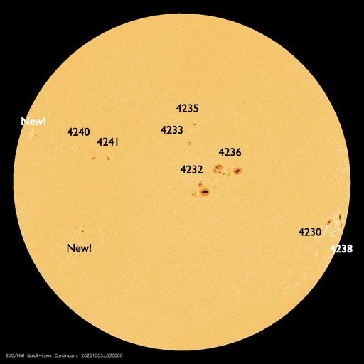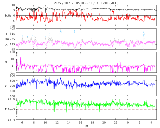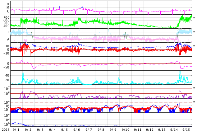 2025/10/ 3 13:56 更新 750km/秒の高速太陽風が続いています。磁気圏活動も活発です。 担当 篠原 太陽風の速度は、750km/秒前後で推移しています。 かなり高まった状態が続いています。 磁場強度は6nTと、昨日からは少し下がっていますが、 平均的な値で安定しています。 磁場の南北成分は、-3nT程度の南寄りの傾向が続いています。 磁気圏の活動は活発に続いていて、 AE指数は、1000〜1500nTの大きい変化が頻繁に発生しています。 GOES衛星SUVI 195では、 南半球のコロナホールは、東西に長く伸びています。 27日周期の図を見ると、 前周期の太陽風は、今日に相当する9月6日から速度が高まり、 9月10日にかけて高速風が続いています。 コロナホールの広がりが変化していることもあり、 今回は、この後どの様に推移するでしょうか。 注目して下さい。 太陽は、昨日の昼のM1.2中規模フレア以降変化が少なくなっていて、 C3程度の小規模フレアが発生した程度です。 可視光写真では、 太陽の中心部に4236、4232黒点群が見えていますが、 活動は落ち着いている様です。