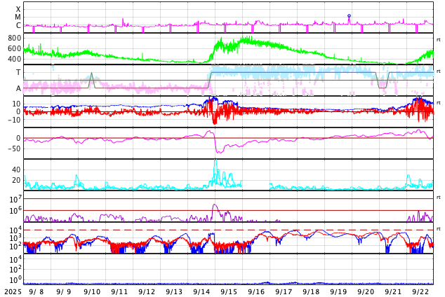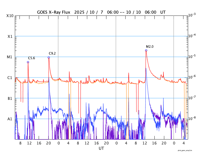 GOES衛星の太陽X線強度。赤・橙 = 0.1〜0.8 nm、青・紫 = 0.05〜0.4 nm (c) データ:NOAA/SWPC、作図:宇宙天気ニュース ![]() | ||||||||||||||||||||||||||||||||||||||||||||||||||||||||||||||||||||||||||||||||||||||||||||||||||||||||||||||||||||||||||||||||||||||||||||||||||||||||||||||||||||||||||||||||||||||||||||||||||||||||||||||||||||||||||||||||||||||||
