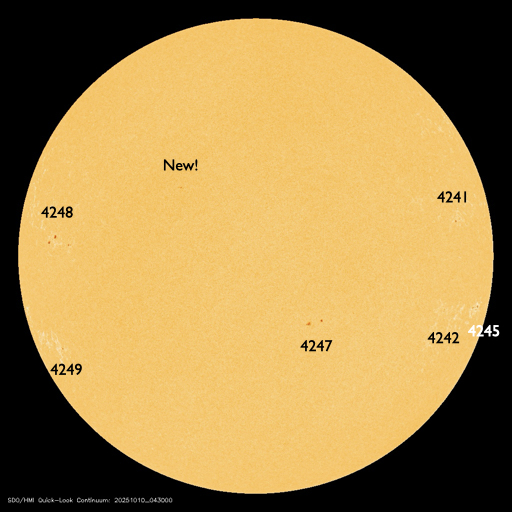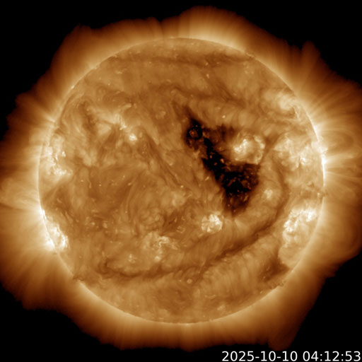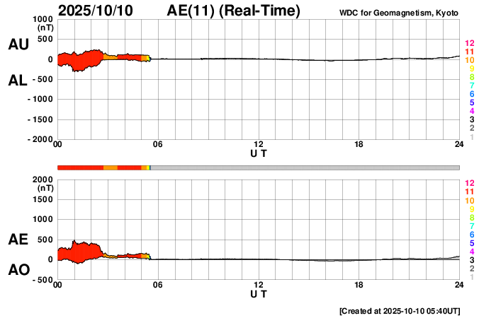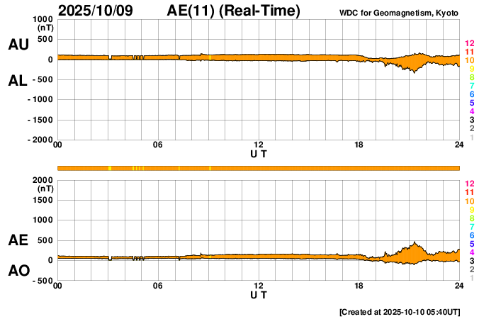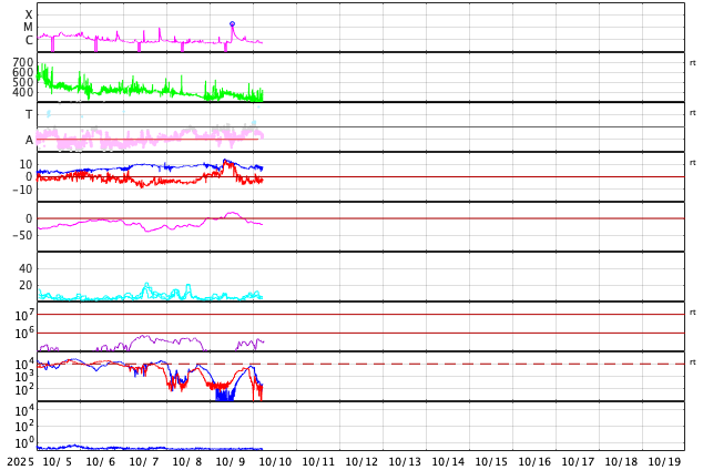2025/10/10 14:45 更新 太陽風の速度は300km/秒とより低速になっています。 担当 篠原 太陽風の速度は、 グラフの初めに340km/秒から400km/秒に急に上がる変化が発生しています。 その後は低下が続き、現在は300km/秒に下がっています。 低速の状態です。 磁場強度も8nTから14nTに急に強まりましたが、 その後は低下して、現在は8nTに戻っています。 磁場の南北成分は、太陽風の強まりの時に北向きに大きく変化し、 その後南向きに切り替わって、 以降、-3〜 -5nT程度の南向きの状態が続いています。 速度が下がっているため影響は限定的ですが、 AE指数は、後半で400nTの小規模の変化が発生しています。 GOES衛星SUVI 195の太陽コロナ写真では、 コロナホールが西側(右側)に進んでいます。 明日くらいから太陽風の速度が高まる可能性があります。 27日周期の図を見ると、前周期は9月15日から速度が高まっていて、 これは、明後日、10月12日に相当します。 どのタイミングで変化が始まるでしょうか。 太陽は、昨夜、9日21時(世界時9日12時)に、 北西の端(右上)で、M2.0の中規模フレアが発生しました。 GOES衛星SUVI 131の動画を掲載します。 動画ではコロナの噴出が見えていますが、 CME(コロナ質量放出)は小規模でした。 その他は目立った変化は発生していません。