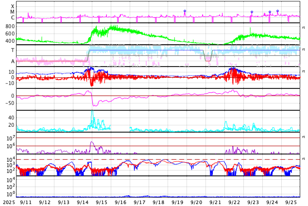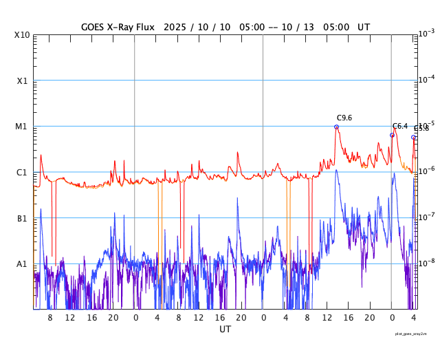GOES衛星の太陽X線強度。赤・橙 = 0.1〜0.8 nm、青・紫 = 0.05〜0.4 nm (c) データ:NOAA/SWPC、作図:宇宙天気ニュース ![]() | ||||||||||||||||||||||||||||||||||||||||||||||||||||||||||||||||||||||||||||||||||||||||||||||||||||||||||||||||||||||||||||||||||||||||||||||||||||||||||||||||||||||||||||||||||||||||||||||||||||||||||||||||||||||||||||||||||||||||||||||||||||||||