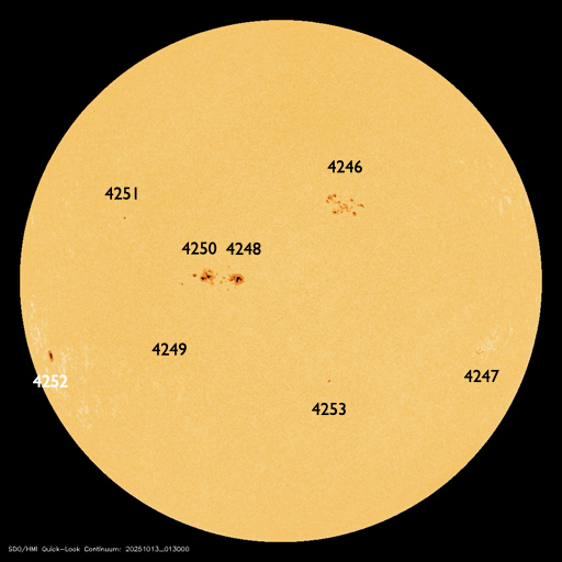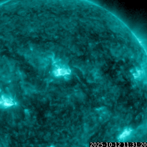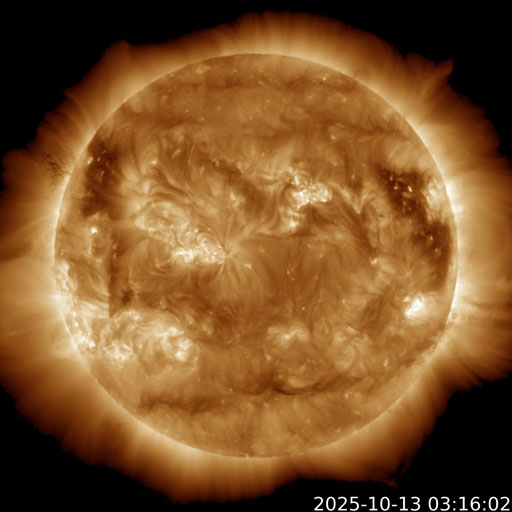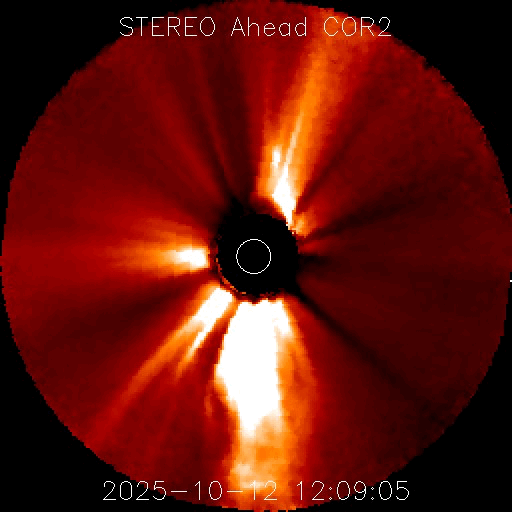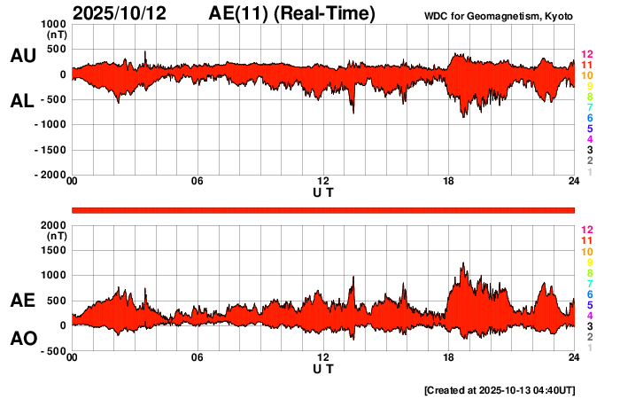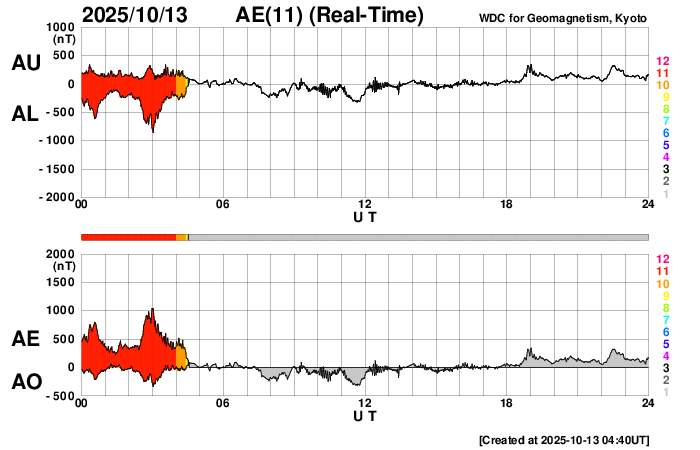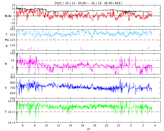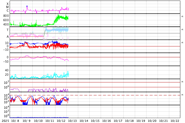 2025/10/13 13:48 更新 太陽風は700km/秒台の高速風が続いています。C9.6、C9.3の小規模フレアが発生しました。 担当 篠原 昨日のニュースの後、太陽風の速度は750km/秒へ高まり、 しばらくこの状態が続いて、少し下がり、 その後は700km/秒で推移しています。 かなり高まった状態が続いています。 磁場強度は、10nTから5nTへ下がり、 現在は平均的な値です。 磁場の南北成分は、南北に細かく変化しています。 磁気圏の活動は高まった状態が続いていて、 AE指数は、500nTを超えるくらいの中規模の変化が続き、 時々、1000nTに達する大きい変化も発生しています。 GOES衛星SUVI 195では、 現在の高速風の発生源と考えられるコロナホールは、 北西の端(右上)に近付いています。 このため、高速風は後半に入りそうです。 また、北東の端(左上)には、次のコロナホールが見え始めています。 1週間後くらいに、この領域の影響が到来しそうです。 太陽は、中心部北側の4246黒点群で、 昨夜、12日22時半(世界時12日13時半)に、 C9.6と大きい小規模フレアが発生しました。 GOES衛星SUVI 131と195の動画を掲載します。 この動画の195の写真(茶色)に注目すると、 フレアの後に、広い範囲でコロナが動く様子が見えています。 CME(コロナ質量放出)が発生している様です。 太陽を地球よりも右斜めから観測している STEREO Ahead衛星のCOR2を見ると、 太陽の左上に向かってガスが飛び出す様子が見えています。 3日後くらいに太陽風の弱い乱れが到来するかもしれません。 磁場の強まりがやって来て、南向きに大きく変化すると、 磁気圏の活動が強まる可能性があります。 どの様な変化が見られるでしょうか。 4246群では、この後もフレアが続いていて、 C3.3、C4.4、C3.5、C9.3などの小規模フレアが発生しています。 また、X線グラフの最後のC5.8小規模フレアは、 中心部東側(左側)の4248群で発生しています。