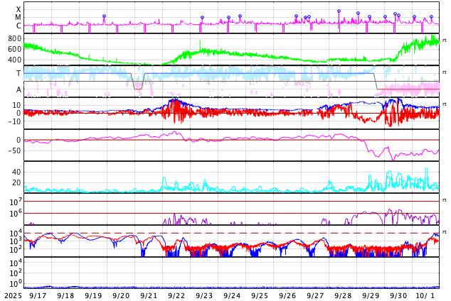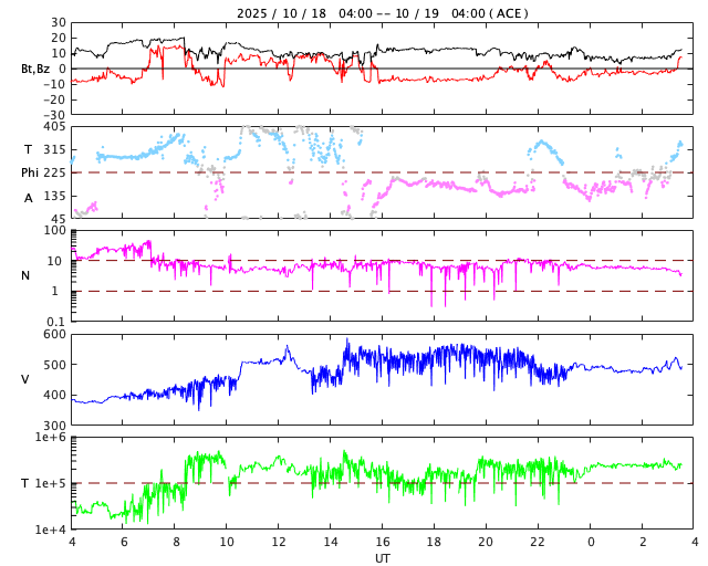 2025/10/17 13:56 太陽風は平均的な状態です。磁気圏は穏やかです。