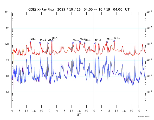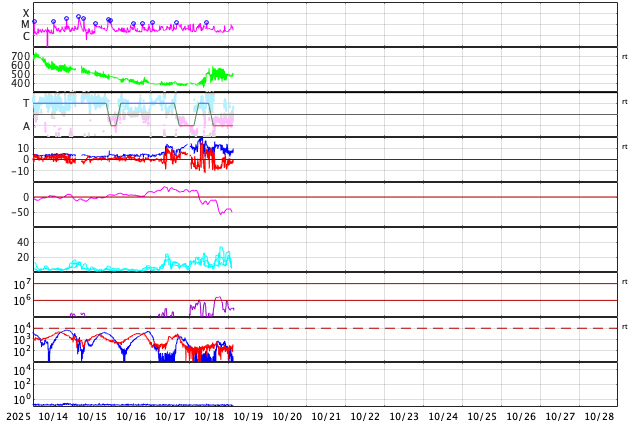 2025/10/18 13:48 太陽風は平均的な速度で安定しています。Mクラスフレアの発生が続いています。
