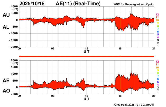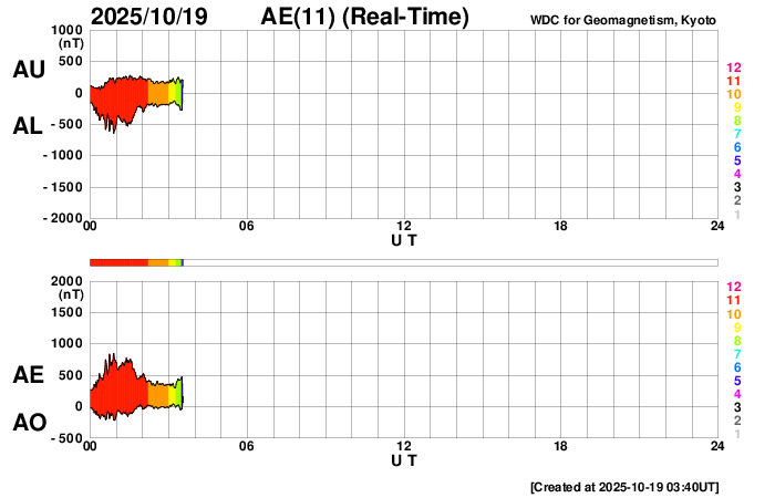 下段のAEグラフの値が高くなると、オーロラ活動が活発化しています。