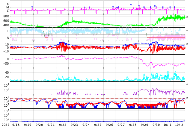 GOES衛星の太陽X線強度。赤・橙 = 0.1〜0.8 nm、青・紫 = 0.05〜0.4 nm (c) データ:NOAA/SWPC、作図:宇宙天気ニュース ![]() | ||||||||||||||||||||||||||||||||||||||||||||||||||||||||||||||||||||||||||||||||||||||||||||||||||||||||||||||||||||||||||||||||||||||||||||||||||||||||||||||||||||||||||||||||||||||||||||||||||||||||||||||||||||||||||||||||||||||||||||||||||||||||||||||||||||||||||||||||||||||||||||||||