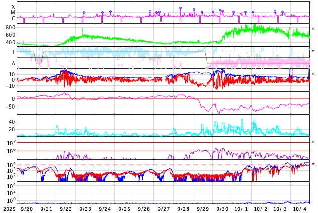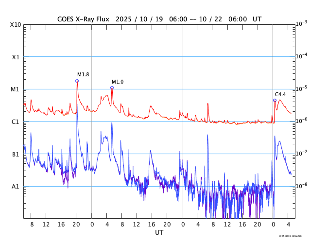 2025/10/18 13:48 太陽風は平均的な速度で安定しています。Mクラスフレアの発生が続いています。