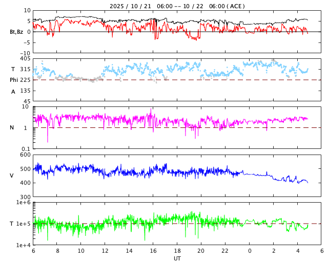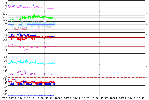 2025/10/21 12:52 500km/秒台の高速太陽風が続いています。磁気圏は比較的穏やかです。
