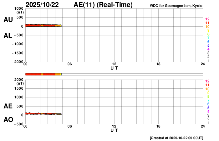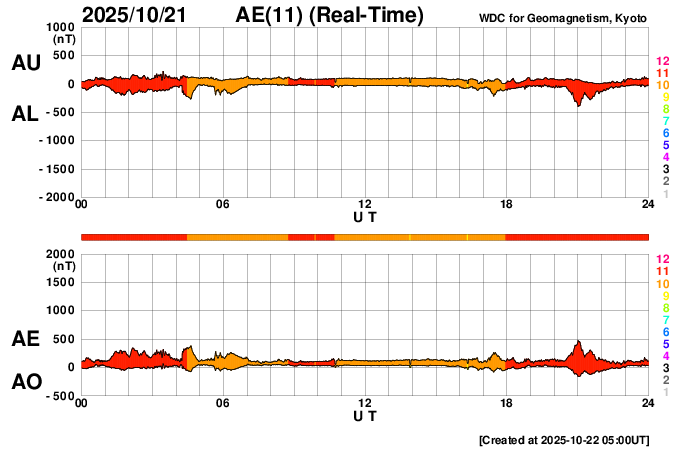 下段のAEグラフの値が高くなると、オーロラ活動が活発化しています。
