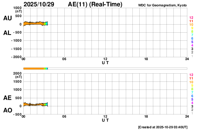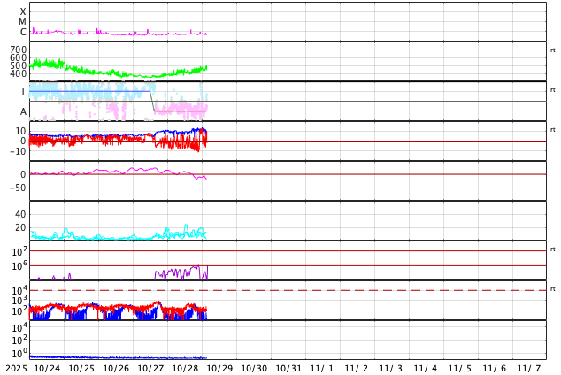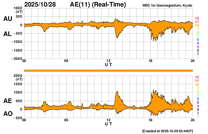 2025/10/29 12:41 更新 太陽風はやや高速になっています。コロナホールの影響が始まりそうです。 担当 篠原 太陽風の速度は、 昨日のニュースの後に400km/秒と平均的な速さに上がり、 今朝には450km/秒へ上がって、 グラフの最後は480km/秒とやや高速になっています。 このまま更に高まって行きそうです。 引き続き注目してください。 太陽風の磁場強度は、10nT前後と強まった状態が続いています。 南北成分は、南向きに強まる変化が続いていましたが、 グラフの最後はやや北寄りになっています。 この後は、どの様な傾向になるでしょうか。 AE指数は、1000nTに達する大きい変化が2回発生しています。 磁場が南向きに強まった影響でしょう。 一方、AE指数のグラフの最後は変化が小さくなっています。 これは、磁場が北寄りに変わったためでしょう。 GOES衛星SUVI 195では、 南半球のコロナホールは、 一番後ろ(左端)が太陽の中心線を通過しようとしています。 このため、太陽風速度の高まりは、 これから4日後くらいまで続きそうです。 実際にはどうなるでしょうか。 太陽は、中心部の4267黒点群で C1.6の小さい小規模フレアが起きた程度で、 穏やかな状態が続いています。 可視光写真では、東側(左側)は黒点が少なく、 寂しい太陽面になっています。