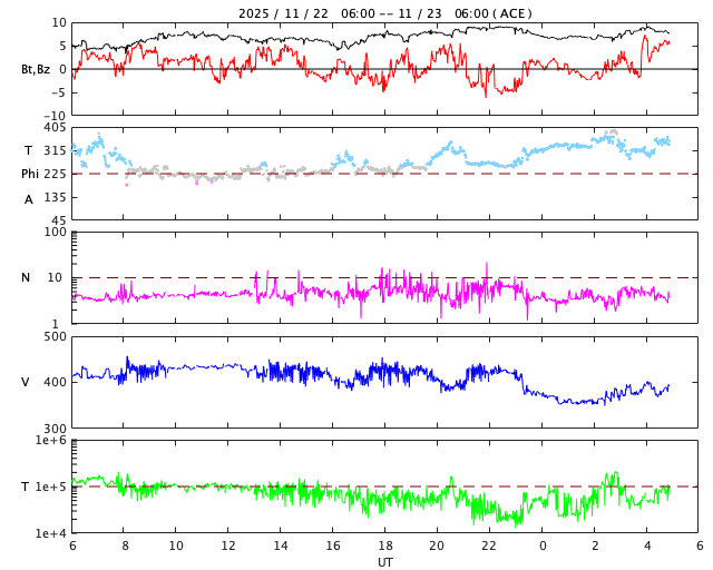 - 2025/11/19 13:24 太陽風は平均的な速度に戻っています。磁気圏も穏やかです。