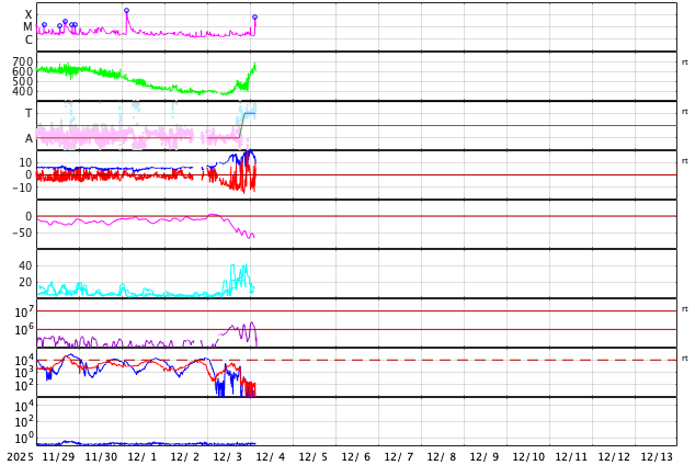 2025/12/ 4 12:23 更新 高速太陽風が到来して、速度は650km/秒に高まっています。11月の黒点相対数は 91.8 でした。 担当 篠原 WDC-SILSO より、11月の黒点相対数月平均値は、 91.8 と発表されました。 5月の 78.5 以来、第25期の極大を過ぎた後としては2回めの2桁です。 10月は 114.6 だったのですが、 グラフを見ると、11月は大きく下がったという印象です。 1日値を見ると、 X5.0の大規模フレアを起こした4274黒点群が見えていた頃の、 11月6日から15日にかけての10日間は、 最大 154 など 100以上の値が続いていたのですが、 その他はほぼ2桁でした(20日のうち18日)。 最小は、11月1日の 20 です。 黒点相対数の1日値がここまで小さくなったのは、 2022年6月8日の 3 以来、3年5か月ぶりです。 1枚めの図を見ると、第25期の初めの頃以来ということになります。 太陽風は、4日1時(世界時3日16時)頃から速度が高まり始め、 初めは400km/秒から450km/秒に少し上がった程度でしたが、 今朝、4日7時(世界時3日22時)頃からは本格的に高まり、 現在は650km/秒とかなり高速になっています。 磁場強度は、10〜20nTと強まった状態で推移しています。 GOES衛星SUVI 195の北西側(右上)に見えている コロナホールの影響が始まった様です。 27日周期の図を見ると、高まりは同じくらいに始まっています。 前回は、800km/秒まで速度は高まりました。 今回はどうなるでしょうか。 太陽風磁場の南北成分は、 南寄りで強まっていて、-10nT程度の変化が続いています。 磁気圏の活動は激しくなっていて、 AE指数は、1000〜1500nTの大きい変化が何度も発生しています。 現在は速度がかなり高まっているので、 磁気圏の活動も強まりやすい状態です。 GOES衛星SUVI 195では、 コロナホールはすでに中心線を通り過ぎています。 速度の高まりは、もう3〜4日くらいで終わるかもしれません。 太陽は、つい先ほど、4日11時半(世界時4日2時半)に、 北東(左上)の4300黒点群でM6.0の中規模フレアが発生しました。 GOES衛星SUVI 131の動画を掲載します。