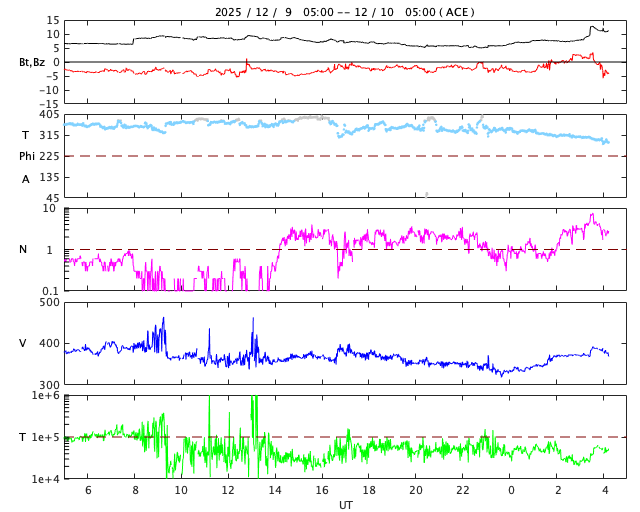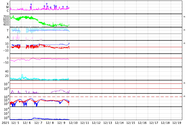 2025/12/10 13:22 更新 太陽風は低速で、磁気圏は穏やかです。フレアの発生が続いています。 担当 篠原 太陽風の速度は、380km/秒から330km/秒へゆっくり下り、 グラフの最後で380km/秒へ上がっています。 低速の状態が続いています。 磁場強度は、7nTからグラフの途中で9nTに強まり、 その後5nTへ下がって、最後で10nTを超えるくらいに上がっています。 細かい乱れがやって来ている様です。 磁場の南北成分は、弱い南寄りが続いていますが、 速度が下がっているため、磁気圏は基本的に穏やかで、 AE指数は、グラフの途中で 300nTの小規模の変化が起きている程度です。 太陽風のグラフの最後で、 磁場の南北成分は0nT付近に上がっています。 この状態が続くと、磁気圏は穏やかな状態が続くでしょう。 GOES衛星SUVI 195では、 北半球のコロナホールが太陽の中心線に達しています。 3日後くらいから、太陽風速度の高まりが始まる可能性があります。 コロナホールは高緯度側に広がっています。 どの程度の影響がやって来るでしょうか。 太陽は、南西(右下)の4294黒点群で、 M1.6、M1.5の中規模フレアや、 C6.0、C5.6、C5.0、C7.8、C8.0、C9.5などの 小規模フレアが多く発生しています。 また、左側の4296群でも、M1.5の中規模フレアが発生しています。 太陽の西の端(右端)に近づいていますが、 見えている間は注目して下さい。 ![]() GOES衛星のSUVI 195カメラによる太陽コロナの様子 (c) NOAA/SWPC ![]() SDO衛星による太陽の可視光写真(SOHO衛星の画像ページより取得)。 マウスの矢印を写真に重ねると、黒点番号付きの写真に切り替わります。 (c) SDO (NASA) ![]() ACEが観測した太陽風の磁場(黒線は全体の強度、赤線は南北成分) 磁場の向き、プラズマの密度、速度、温度 (c) データ:NOAA/SWPC、作図:宇宙天気ニュース ![]() AE指数(速報値) 下段のAEグラフの値が高くなると、オーロラ活動が活発化しています。 (c) 京都大学WDC ![]() ![]() 27日の太陽周期に合わせた図 太陽が同じ面を地球に向けていた27日前の変化から、今後を予想することができます。 (c) 作図:宇宙天気ニュース