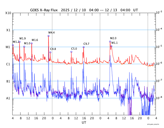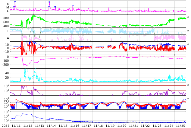GOES衛星の太陽X線強度。赤・橙 = 0.1〜0.8 nm、青・紫 = 0.05〜0.4 nm (c) データ:NOAA/SWPC、作図:宇宙天気ニュース ![]() | ||||||||||||||||||||||||||||||||||||||||||||||||||||||||||||||||||||||||||||||||||||||||||||||||||||||||||||||||||||||||||||||||||||||||||||||||||||||||||||||||||||||||||||||||||||||||||||||||||||||||||||||||||||||||||||||||||||||||||||||||||||||||||||||||||||||||||||||||