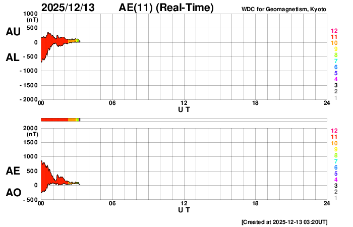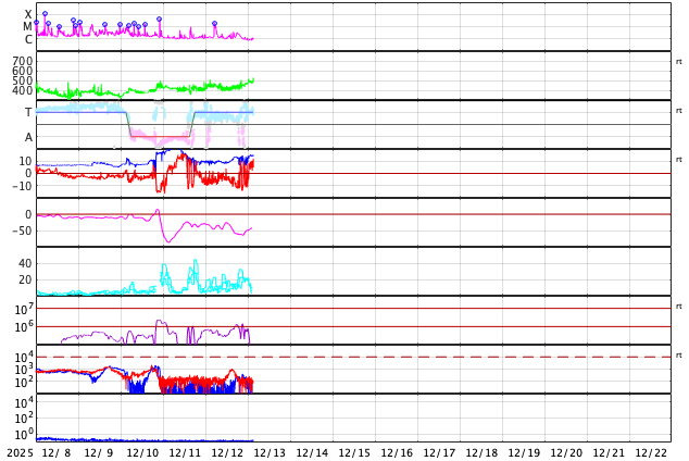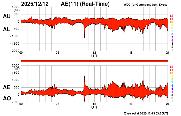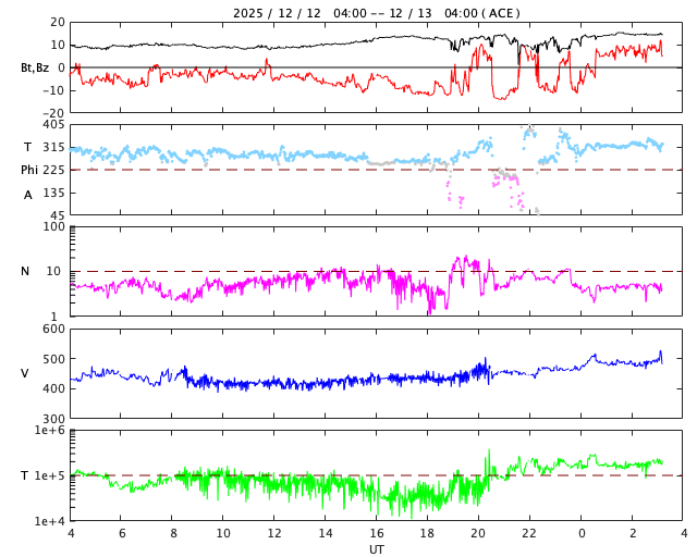 2025/12/13 12:25 更新 太陽風の速度が500km/秒に高まっています。太陽は穏やかになりそうです。 担当 篠原 昨日のニュースの後、太陽風の速度は420km/秒で推移していましたが、 今朝くらいからゆっくりと高まって、 ちょうど500km/秒と高速の状態に達したところです。 GOES衛星SUVI 195で見えていた コロナホールの影響がやって来た様です。 太陽風の磁場強度は、 10nTから15nTへ更に強まっています。 このため、速度はこの後も上昇が続くかもしれません。 磁場の南北成分は、 南向きの強まりが続き、磁気圏の活動も活発な状態が続きました。 AE指数は、500〜1000nTの中規模の変化が連続しています。 しかし、太陽風のグラフの最後で、 南北成分は北向きに切り替わっています。 この状態が続くと、磁気圏の活動は静かになるでしょう。 GOES衛星SUVI 195を見ると、 コロナホールは、高緯度域で大きく曲がって、 東側(左側)で赤道まで伸びています。 高速の太陽風は、この後どの様に推移するでしょうか。 変化に注目して下さい。 太陽は、南西の端(左下)の4296、4294黒点群で、 M2.0、M1.1の中規模フレアが発生しています。 2つの領域は太陽の向こう側に進むので、 太陽は穏やかになりそうです。